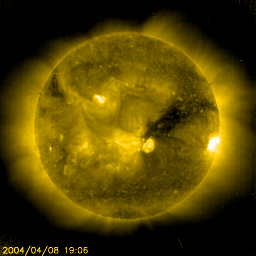 2004/ 4/ 9 10:25 更新 太陽風の速度は下がり磁気圏は静穏です。また新しい衝撃波が地球に向かっています。 2004/ 4/ 9 14:16 追加 衝撃波が到着しました。磁気圏の乱れは小規模です。 担当 篠原 一昨日からお伝えしている太陽からの衝撃波はまだ地球に届いていません。 もうしばらく注意が必要です。 到着が遅れているという事は速度が遅い事を示していますので、影響は小さな規模に留まりそうです。 また新たに、8日19時(世界時8日10時)にC7.4の小規模フレア(太陽爆発)が発生しました。 これに伴って再びfull halo CME (太陽から放出されたガスが、太陽を取り囲む様に広がって見える現象) が観測されています(SOHO LASCO C3画像を参照)。 広がるガスが比較的希薄なので、地球への影響は小さいと予想されますが、 10日の夜から11日にかけて衝撃波の到来が考えられます。 引き続いて、オーロラが活発になったり、小規模の磁気嵐が発生する可能性があります。 太陽風の速度は現在450km/秒に下がっています。 AE指数を見ると、500nT前後の弱いオーロラ活動が断続的に見られています。 SOHO EIT284の太陽画像では、コロナホールの最後の部分が地球へ影響する位置に残っていますが、 コロナホールの影響はこのまま弱まっていきそうです。 今後の展開ですが、上記の2つの衝撃波に伴う突発的な擾乱要因がありますが、 周期性の擾乱について検討すると、27日周期の図からは10日以上にわかって静穏な日が続く事が予想されます。 SOHO EIT284カメラの太陽画像では東半分(左半分)側にはコロナホールは見られず、 当分の間太陽風も磁気圏も穏やかになりそうです。 2004/ 4/ 9 14:16 追加 (篠原) 関連の図はページの最後にあります 9日11時半(世界時9日2時半)に衝撃波が地球へ到達しました。 太陽風の速度は500〜550km/秒にやや上昇し、磁場強度も8nTくらいに強まっています。 (ACE衛星は地球よりも太陽寄りにあるため、地上より40分程早く衝撃波を観測しています) いずれも上昇値としては小さく、磁気圏が大きく乱れる事はないでしょう。 AE指数を見ても、オーロラ活動がやや強まっている程度です。 SOHO衛星のEIT284カメラの映像 (c) SOHO (ESA & NASA)