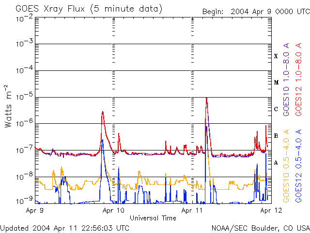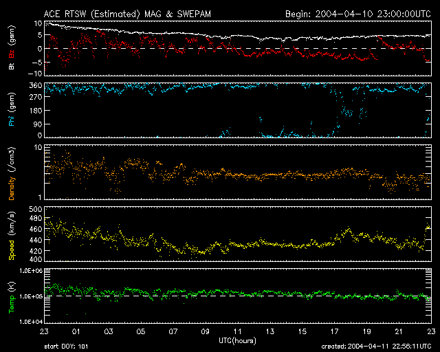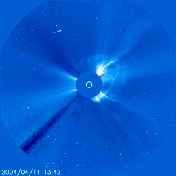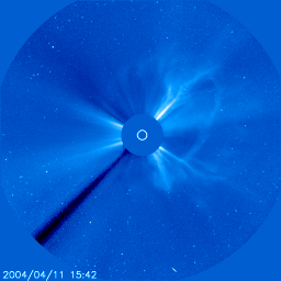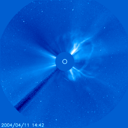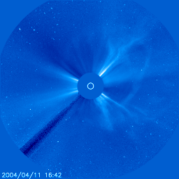 2004/ 4/12 07:58 更新 full halo CMEが発生しました。明日の夕方以降注意が必要です。 担当 篠原 11日13時(世界時11日4時)にC9.6の小規模フレア(太陽爆発)が発生しました。 今回も、太陽黒点の588群で発生しています。 これに伴ってfull halo CMEが発生しました。SOHO LASCO C3の画像をご覧下さい。 このCMEによる高速太陽風が13日夕方から14日にかけて地球に到達する可能性があります。 ここ数回のCMEの中で一番はっきり見えていますので、今回は強い擾乱が発生するかもしれません。 太陽風の状況に依りますが、衝撃波の到来後、 オーロラ活動が活発になったり、磁気嵐が発達することが考えられます。 現在の太陽風は、速度400〜450km/秒と静穏レベルです。 磁場強度は5nTあります。そして、小さい値ですが南を向く時間帯も目立っています。 このためAE指数では500nT弱と、弱いオーロラの活動が見られています。 衝撃波が地球に到達するまでは、このまま穏やかな状態が続くでしょう。 SOHO衛星のLASCO C3カメラの映像 (c) SOHO (ESA & NASA)