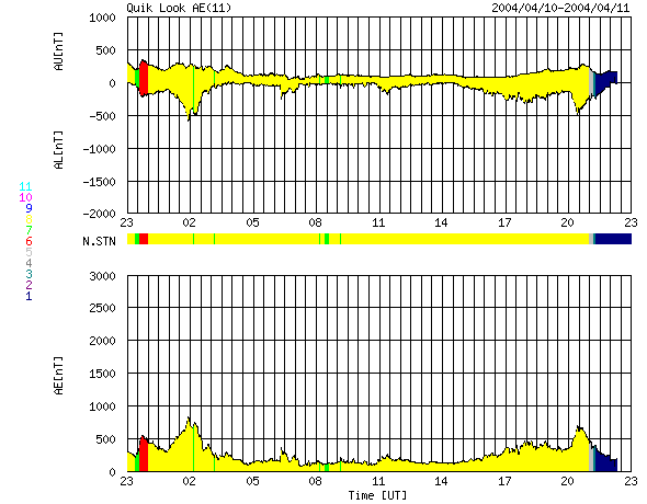 GOES衛星の太陽X線データ (c) NOAA/SEC ![]() SOHO衛星のMDIカメラによる太陽黒点 (c) SOHO (ESA & NASA) ![]() ACEが観測した太陽風の磁場(1番上の枠、白線は全体の強度、赤線は南北成分) および、太陽風の密度(3番目の橙線)、速度(4番目の黄線) (c) NOAA/SEC ![]() リアルタイムAE指数 下段のAEグラフの値が高くなると、オーロラ活動が活発化しています。 (c) 京都大学, NICT ![]() | |||||||||||||||||||||||||||||||||||||||||||