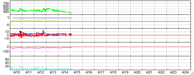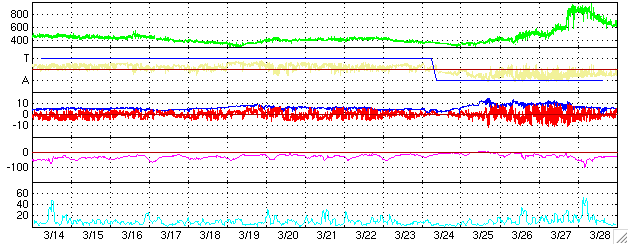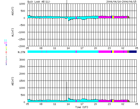ACEが観測した太陽風の磁場(1番上の枠、白線は全体の強度、赤線は南北成分) および、太陽風の密度(3番目の橙線)、速度(4番目の黄線) (c) NOAA/SEC ![]() リアルタイムAE指数 下段のAEグラフの値が高くなると、オーロラ活動が活発化しています。 (c) 京都大学, NICT ![]() 27日の太陽周期に合わせたデータプロット (太陽風版) 太陽が同じ面を地球に向けていた27日前の変化から、今後を予想することができます。 (c) NICT