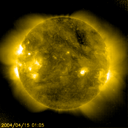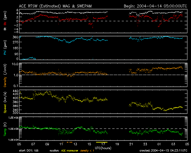 2004/ 4/15 13:21 更新 太陽風の速度は350km/秒まで下がっています。磁気圏はたいへん穏やかです。 担当 篠原 太陽風の速度は一層低下し、350km/秒に下がっています(ACEデータの黄色線)。 ただし、太陽風の粒子の密度(橙色線)が、 通常レベルの1個/ccから5個/ccへ上昇を示しています。 これが直ちに擾乱を起こす事はありませんが、太陽風の変化にしばらく注意が必要です。 磁気圏はとても穏やかで、AE指数ではオーロラ活動がほとんど見られませんでした。 SOHO EIT284カメラの太陽画像ではコロナホール(やや暗く見える領域)は見られません。 太陽が同じ面を地球に向けていた27日前のデータから、これからの宇宙天気を予想します。 現在は太陽活動が穏やかになっている時期です。 この期間は安定して27日の周期で太陽風の変化が発生し、磁気圏が周期的に乱れる傾向があります。 (ただし、太陽フレア(太陽活動)による突発的な擾乱はこの方法からは予想できません。ご注意ください。) 27日周期の図をご覧下さい。 27日前に当たる3月19日前後も穏やかな状態が続いていました。 その後、太陽風の磁場がやや強くなって(南向き成分も含んでいるため)、 オーロラ活動がやや活発になった様ですが、小規模な活動です。 3月24日以降に、太陽風磁場のセクターの切り替わりがあり、続いて磁場強度の増加、 コロナホールによる高速太陽風の到来と次第に擾乱が強まっていきました。 今日以降も、これからしばらく小規模なオーロラ活動が続いて、4月20日以降に本格的に擾乱が始まる という経過をたどる事が予想されます。 最後に、太陽フレアの活動は現在も穏やかです。 太陽黒点の591群がやや発達していますし、東縁(左縁)からは新しい黒点群が上りつつあります。 今後、状況が変わっていくかもしれません。 SOHO衛星のEIT284カメラの映像 (c) SOHO (ESA & NASA)