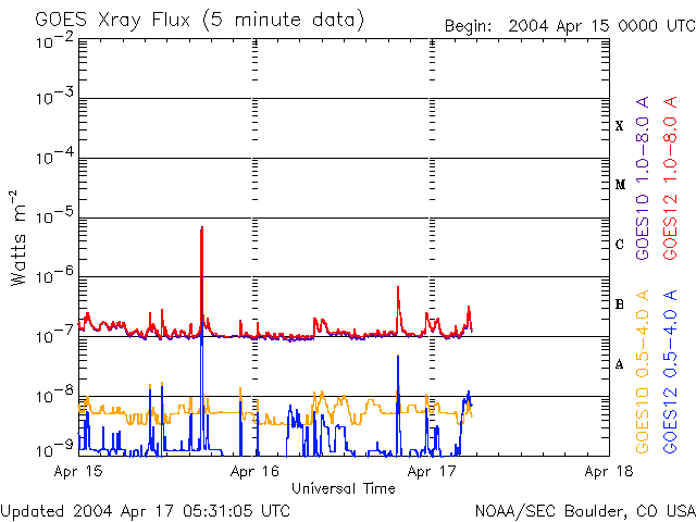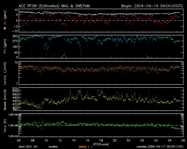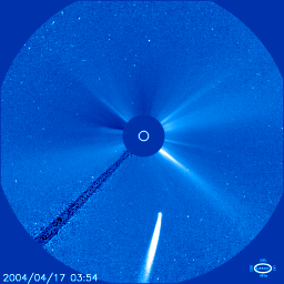 2004/ 4/17 14:31 更新 引き続き、オーロラ活動がやや活発です。 担当 篠原 昨日の続きになりますが、ブラッドフィールド彗星が長い尾を見せ始めました。 SOHO LASCO C3カメラの太陽画像をご覧下さい。 この彗星はオーストラリアのブラッドフィールドさんが3月23日に発見しました。 ブラッドフィールド彗星という名前は以前にも耳にした事があるかもしれませんが、 今回で18個めの新彗星発見だそうです。 太陽風の状況は昨日とほぼ同じです。 速度は静穏時よりやや速めの450km/秒。磁場強度が7nT程度あり、南を向く時間帯が頻繁に見られます。 このため、オーロラ活動がやや活発な状態が続いています。 AE指数では500nT前後の変動が見られています。 この状態はまだ3日ほど続く可能性があります。 太陽のフレア活動は落ち着いています。 黒点群にも目立った規模のものは無く、静かな状態が続きそうです。 [ 明日の更新は夕方以降になります。ご了承ください ] SOHO衛星のLASCO C3カメラの映像 (c) SOHO (ESA & NASA)