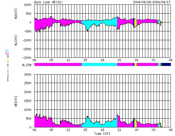 ACEが観測した太陽風の磁場(1番上の枠、白線は全体の強度、赤線は南北成分) および、太陽風の密度(3番目の橙線)、速度(4番目の黄線) (c) NOAA/SEC ![]() リアルタイムAE指数 下段のAEグラフの値が高くなると、オーロラ活動が活発化しています。 (c) 京都大学, NICT ![]() GOES衛星の太陽X線データ (c) NOAA/SEC ![]() SOHO衛星のMDIカメラによる太陽黒点 (c) SOHO (ESA & NASA) ![]() | ||||||||||||||||||||||||||||||||||||||||