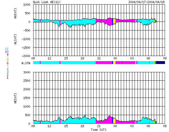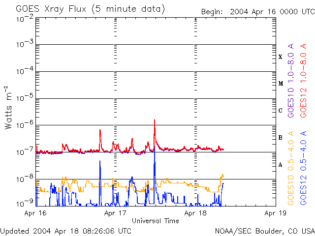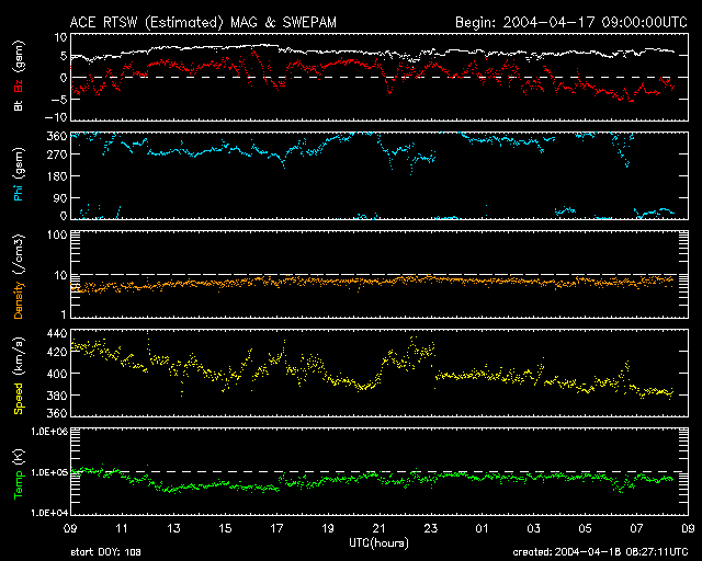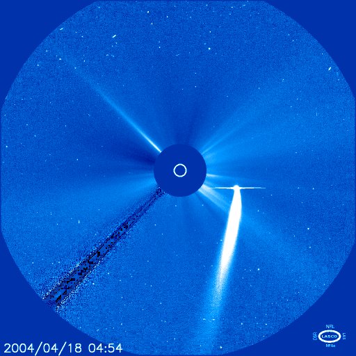 2004/ 4/18 17:29 更新 太陽風速度が低下し、オーロラ活動は弱まっています。 担当 篠原 ブラッドフィールド彗星が雄大な姿を見せています。 今日はやや大きい写真で紹介したいと思います。 写真中央の白い丸が太陽の大きさです。 今私たちが仰いでいる青空の中、太陽のすぐ横にこの彗星が輝いているのです。 2日ほど弱いながらもオーロラ活動が続いていましたが、 太陽風の様子がやや変わり、活動が更に弱い規模に下がっています。 オーロラ活動の指標であるAE指数では500nT未満の弱いレベルに低下しています。 これは、太陽風の速度(ACEデータの黄色線)が400km/秒を切る程に低下したことと、 太陽風磁場の南向き成分(赤線のマイナス方向)があまり見られなくなったためでしょう。 太陽風の速度が低下していますので、穏やかな状態が続くでしょう。 GOES衛星のX線観測では、太陽フレアは穏やかな状態が続いています。 SOHO衛星LASCO C3カメラの中に姿を現したブラッドフィールド彗星(日本時間18日13時54分) (c) ESA & NASA ![]() ACEが観測した太陽風の磁場(1番上の枠、白線は全体の強度、赤線は南北成分) および、太陽風の密度(3番目の橙線)、速度(4番目の黄線) (c) NOAA/SEC ![]() リアルタイムAE指数 下段のAEグラフの値が高くなると、オーロラ活動が活発化しています。 (c) 京都大学, NICT ![]() GOES衛星の太陽X線データ (c) NOAA/SEC ![]() | |||||||||||||||||||||||||||||||||||||||