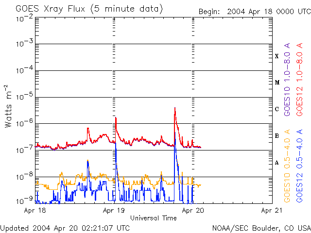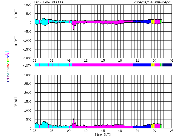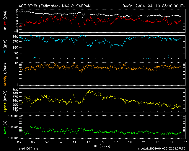 ACEが観測した太陽風の磁場(1番上の枠、白線は全体の強度、赤線は南北成分) および、太陽風の密度(3番目の橙線)、速度(4番目の黄線) (c) NOAA/SEC ![]() リアルタイムAE指数 下段のAEグラフの値が高くなると、オーロラ活動が活発化しています。 (c) 京都大学, NICT ![]() SOHO衛星のMDIカメラによる太陽黒点 (c) SOHO (ESA & NASA) ![]() GOES衛星の太陽X線データ (c) NOAA/SEC ![]() | ||||||||||||||||||||||||||||||||||||||||