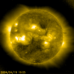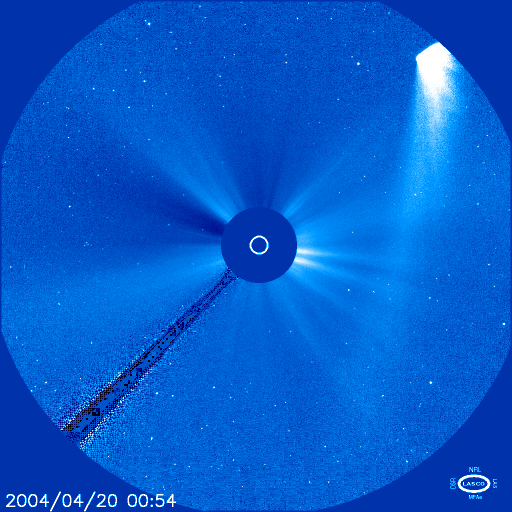 2004/ 4/20 11:26 更新 磁気圏は静穏です。ブラッドフィールド彗星がSOHOの画面を去りつつあります。 担当 篠原 ブラッドフィールド彗星が、太陽を横切ってSOHO衛星の画面から去りつつあります。 長い尾が楽しめるのも今日までです。明日は尾だけになっているでしょう。 ACE衛星の観測では、太陽風の速度は低く(約350km/秒)、磁場強度も低下しました(3〜4nT)。 このため磁気圏はとても静かな状態です。 AE指数のグラフでは、オーロラ活動はほとんど見られなかった様です。 SOHO EIT284の太陽画像では、コロナホール(やや暗く見える領域)が中央から下に広がっています。 この影響による太陽風の変化が明日以降見られるでしょう。 太陽面では黒点数が増え、にぎやかになって来ています。 東(左)側では596群が目立っています。 この群は昨日から今日にかけ、Cクラスの小規模フレアを2回起こしました。 これからも小・中規模のフレアを起こす可能性がある様です。 SOHO衛星LASCO C3カメラの中に姿を現したブラッドフィールド彗星(日本時間20日9時54分) (c) ESA & NASA ![]() SOHO衛星のEIT284カメラの映像 (c) SOHO (ESA & NASA)