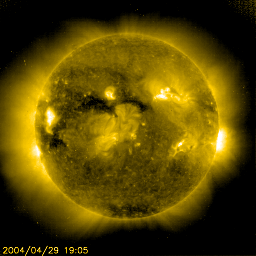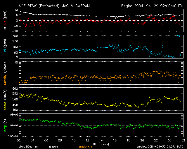 2004/ 4/30 10:35 更新 磁気圏は静穏ですが、太陽風速度は500km/秒とやや高めです。 担当 篠原 ACE衛星の観測によると、太陽風の速度は一旦450km/秒へ下がった後、 再び上昇して500km/秒とやや高いレベルに戻っています。 コロナホールの影響を抜けたため速度が低下したと思われますが、再上昇の理由は不明です。 今後、太陽風の衝撃波の到来が予想されています。しばらく注意が必要です。 現在まで磁気圏は大変静穏で、オーロラの活動を示すAE指数のグラフにはほとんど変化が見られません。 速度が500km/秒に上がっている事から、 太陽風磁場の南向き成分が強まるとオーロラ活動がやや活発化する可能性はあります。 SOHO EIT284カメラの太陽画像では、新たなコロナホールが太陽の中心を過ぎ、西へ(右へ)進んでいます。 コロナホールの影響は、5月3日頃から現れると予想されます。 太陽風の速度が上昇して、オーロラ活動が活発化したり、小規模な磁気嵐が発生する可能性があります。 コロナホールは東西(横方向)に細長く広がっていますので、1週間近く影響が続くと思われます。 太陽のフレア(太陽爆発)活動はたいへん穏やかです。 目立ったフレアの発生は無く、太陽黒点も小規模な黒点群しか見られません。 SOHO衛星のEIT284カメラの映像 (c) SOHO (ESA & NASA)