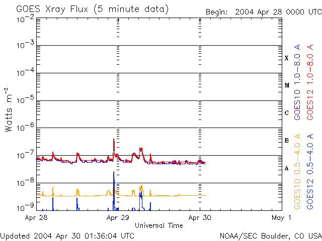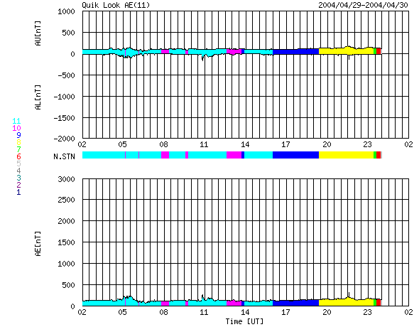 ACEが観測した太陽風の磁場(1番上の枠、白線は全体の強度、赤線は南北成分) および、太陽風の密度(3番目の橙線)、速度(4番目の黄線) (c) NOAA/SEC ![]() リアルタイムAE指数 下段のAEグラフの値が高くなると、オーロラ活動が活発化しています。 (c) 京都大学, NICT ![]() GOES衛星の太陽X線データ (c) NOAA/SEC ![]() SOHO衛星のMDIカメラによる太陽黒点 (c) SOHO (ESA & NASA) ![]() | ||||||||||||||||||||||||||||||||||||||||