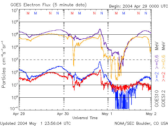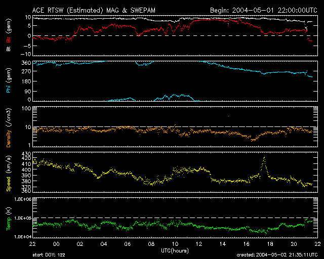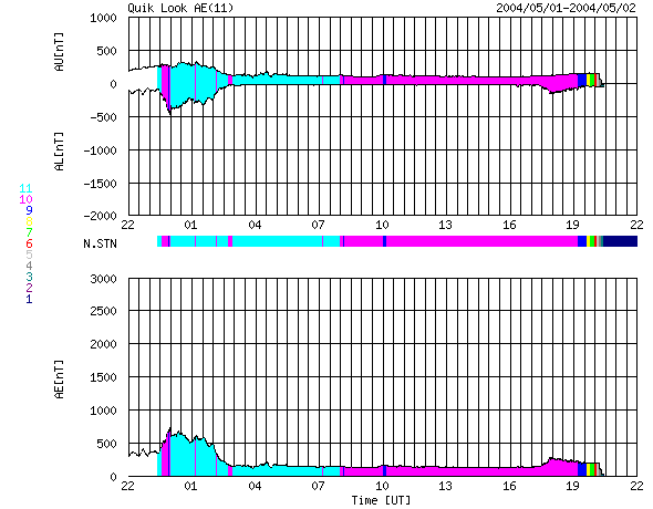 SOHO衛星のMDIカメラによる太陽黒点 (c) SOHO (ESA & NASA) ![]() GOES衛星の太陽X線データ (c) NOAA/SEC ![]() ACEが観測した太陽風の磁場(1番上の枠、白線は全体の強度、赤線は南北成分) および、太陽風の密度(3番目の橙線)、速度(4番目の黄線) (c) NOAA/SEC ![]() リアルタイムAE指数 下段のAEグラフの値が高くなると、オーロラ活動が活発化しています。 (c) 京都大学, NICT ![]() GOES衛星による、静止衛星軌道における高エネルギー電子の変化 (c) NOAA/SEC ![]() | ||||||||||||||||||||||||||||||||||||||||