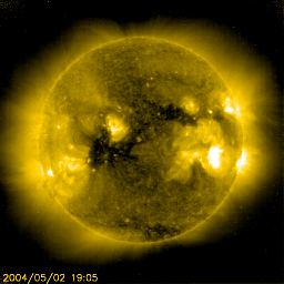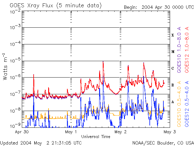 2004/ 5/ 3 06:35 更新 601黒点群が活発です。これからコロナホールによって太陽風の速度が上昇するでしょう。 担当 篠原 太陽黒点601群のフレア(太陽爆発)活動が活発です。 昨日のニュース以降もC5、C8クラスを含む小規模のフレアを数多く発生させています。 X線画像のムービーを見て頂くと、601群が連続的に活動している様子がよく分かります。 特に、2日12時と20時(世界時3時と11時)に発生したフレアでは CME(太陽ガスの放出現象)が発生している可能性があります。 今後SOHO衛星のLASCO C3画像などで確認が必要ですが、 発生していた場合、5日くらいに衝撃波がやって来ると考えられます。 太陽風は370km/秒と速度がとても遅くなっています(ACEデータの黄色線)。 磁場強度(白線)も10nTから下がり始めています。 こちらはこれからコロナホールによる高速風の到来が予想されます。 速度の増加に伴って、太陽風磁場の南向き成分(赤線のマイナス成分)が卓越する様になると、 オーロラ活動が活発になり、磁気嵐が発達する可能性があります。 コロナホールの東西の広がりから、高速風は1週間程度続くと思われます。 (SOHO EIT284画像のやや暗く見えている領域がコロナホールです) 期間の後半では、放射線帯電子の増加も予想されます。 衛星の運用では注意が必要になってくるかもしれません。 SOHO衛星のEIT284カメラの映像 (c) SOHO (ESA & NASA)