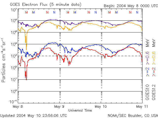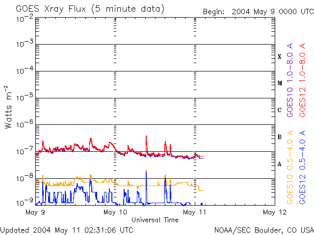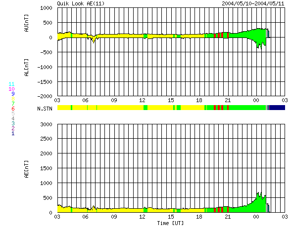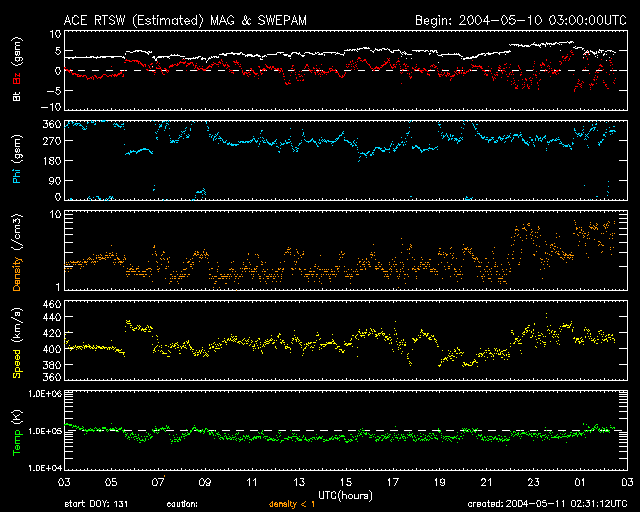 2004/ 5/11 11:31 更新 太陽風の磁場がやや強まっています。オーロラ活動が見られています。 担当 篠原 太陽風の速度は400km/秒の状態が続いています。 一方、太陽風の磁場がやや強まって、5nTを前後するようになっています。 特に、11日7時(世界時10日22時)頃から-5nT程度の南向き成分が見られる様になり、 オーロラ活動をやや活発にしています。 AE指数では、11日9時(世界時11日0時)頃から500nT程度の変化が現れています。 今後の太陽風の変化に注意が必要ですが、速度が低速ですので大きな擾乱に発達する事はないでしょう。 N0AA/SECの発表によると、10日に太陽面でフィラメント消失現象が観測されました。 これによる太陽風及び磁気圏の擾乱が13日頃に発生するかもしれないとのことです。 放射線帯の高エネルギー電子は現在もやや多い状態です。 青線の最大値が10の4乗の線に達しています。衛星運用ではまだしばらく注意が必要でしょう。 太陽のフレア活動はたいへん穏やかです。 太陽黒点では606群がやや大きな姿を見せていますが、発達もしておらず、フレア活動もありません。 ACEが観測した太陽風の磁場(1番上の枠、白線は全体の強度、赤線は南北成分) および、太陽風の密度(3番目の橙線)、速度(4番目の黄線) (c) NOAA/SEC ![]() リアルタイムAE指数 下段のAEグラフの値が高くなると、オーロラ活動が活発化しています。 (c) 京都大学, NICT ![]() GOES衛星による、静止衛星軌道における高エネルギー電子の変化 (c) NOAA/SEC ![]() GOES衛星の太陽X線データ (c) NOAA/SEC ![]() SOHO衛星のMDIカメラによる太陽黒点 (c) SOHO (ESA & NASA) ![]() | |||||||||||||||||||||||||||||||||||||||