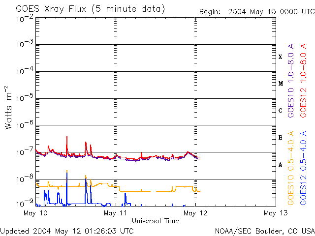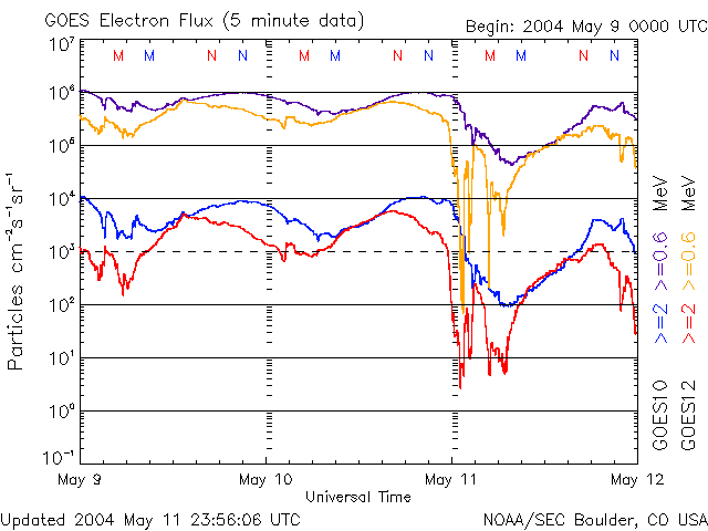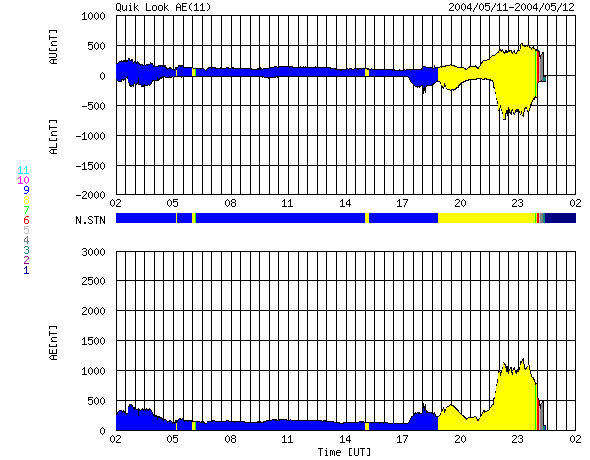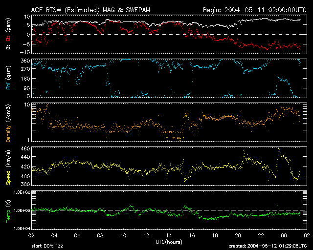 2004/ 5/12 10:30 更新 太陽風磁場の南向きが強まっています。このためオーロラ活動が活発になっています。 担当 篠原 昨日からやや強まっていた太陽風の磁場(ACEデータの白線)ですが、 その後は北向き主体になり(赤線のプラス方向)、磁気圏への影響はほとんど無くなっていました。 しかし、12日3時(世界時11日18時)頃から急激に南向き成分(赤線のマイナス方向)が卓越する様になり、 最大で-8nTに達しています。 このため、AE指数では12日7時(世界時11日22時)頃からかなり強い変動が見られています。 最大で1000nTを越えています。 太陽風の速度は400〜450km/秒と低速ですが、コロナホールの影響でこれから上昇する事も予想され、 その場合は磁気圏の擾乱が更に発達することも考えられます。 磁場が大きく南を向いている間は今後も注意が必要です。 また、昨日お知らせしたフィラメント消失による太陽風の擾乱もこれから観測される可能性があります。 この磁気圏活動に伴う様に、放射線帯の高エネルギー電子の密度は減少しました。 10の4乗の警戒線から既に下がっています。GOES衛星のデータをご覧下さい。 太陽黒点は昨日から目立った変化はなく、フレア活動も大変穏やかです。 SOHO衛星のEIT284カメラの映像 (c) SOHO (ESA & NASA)