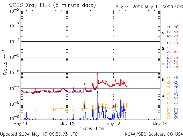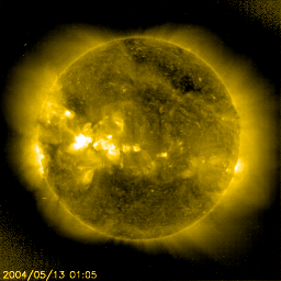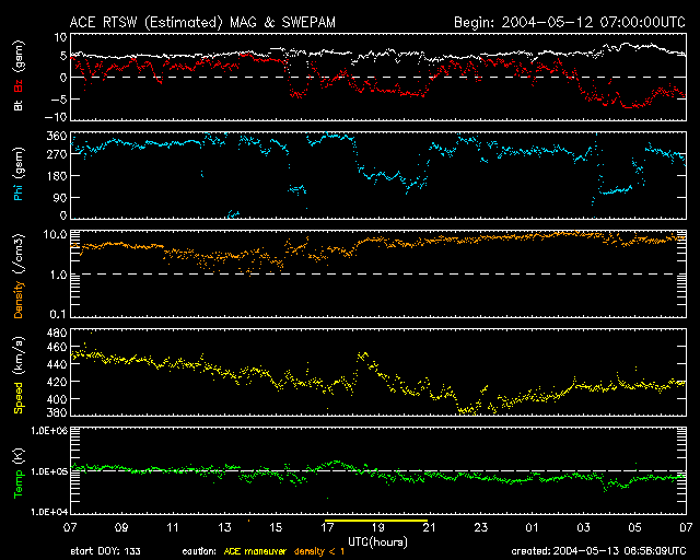 2004/ 5/13 16:00 更新 太陽風磁場のやや強い状態が続いています。これからコロナホールの影響が見られるかもしれません。 担当 篠原 太陽風の磁場強度は5nT強のやや強い状態が続いています(ACEデータの白線)。 速度(黄色線)が420km/秒程度と低速な事もあり、磁気圏に大きな乱れは発生していません。 しかし、13日12時(13日3時)頃から南向き磁場が急に卓越して現れています (赤線がマイナス方向に急に変化しています)。 この影響で、オーロラの活動が活発になる可能性があります。 (現在はAE指数はたいへん穏やかです) SOHO EIT284カメラの太陽画像では、コロナホールが西側(右側)へ去りつつあります。 これからこの影響が地球に及ぶ可能性があります。 短期的な影響に留まると思われますが、一時的に太陽風の速度が上昇する可能性があります。 太陽面では、小さな黒点群が増えています。 どれも規模は小さく、活動度も低い様です。 フレア(太陽爆発)の活動はこれからも穏やかでしょう。 SOHO衛星のEIT284カメラの映像 (c) SOHO (ESA & NASA)
