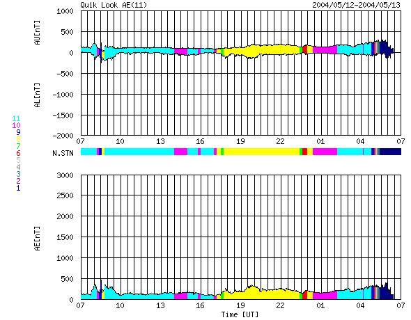 ACEが観測した太陽風の磁場(1番上の枠、白線は全体の強度、赤線は南北成分) および、太陽風の密度(3番目の橙線)、速度(4番目の黄線) (c) NOAA/SEC ![]() リアルタイムAE指数 下段のAEグラフの値が高くなると、オーロラ活動が活発化しています。 (c) 京都大学, NICT ![]() SOHO衛星のMDIカメラによる太陽黒点 (c) SOHO (ESA & NASA) ![]() GOES衛星の太陽X線データ (c) NOAA/SEC ![]() | ||||||||||||||||||||||||||||||||||||||||