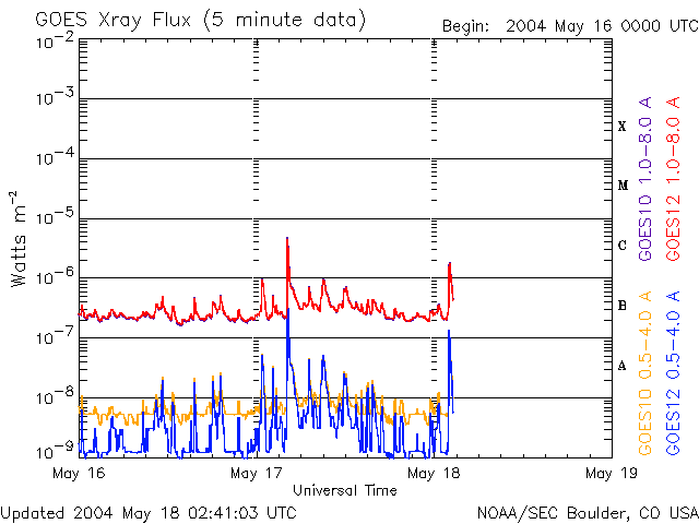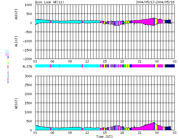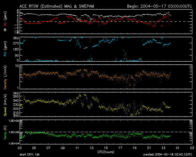 ACEが観測した太陽風の磁場(1番上の枠、白線は全体の強度、赤線は南北成分) および、太陽風の密度(3番目の橙線)、速度(4番目の黄線) (c) NOAA/SEC ![]() リアルタイムAE指数 下段のAEグラフの値が高くなると、オーロラ活動が活発化しています。 (c) 京都大学, NICT ![]() ACEが観測した太陽風の磁場(1番上の枠、白線は全体の強度、赤線は南北成分) および、太陽風の密度(3番目の橙線)、速度(4番目の黄線) (c) NOAA/SEC ![]() GOES衛星の太陽X線データ (c) NOAA/SEC ![]() | ||||||||||||||||||||||||||||||||||||||||