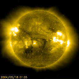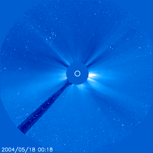 2004/ 5/18 11:41 更新 磁気圏は穏やかです。太陽風の速度は320km/秒に下がっています。 担当 篠原 SOHO LASCO C3の太陽カメラの画像にすばる(プレアデス星団)が見えています。 先日もお伝えしましたが、その時よりもすばるは右へ進んで、太陽に近づいています。 太陽風は320km/秒に下がっています。 磁気圏は穏やかで、オーロラ活動を示すAE指数にはほとんど変化がありません。 小規模なコロナホールがSOHO EIT284カメラの太陽画像に見えています。 中心やや下に縦に細長く見える暗い領域と、その左下にやや広く見えている暗い領域です。 もうひとつ、太陽中心のやや右上にも小規模なホールがある様です。 21日頃からこれらのコロナホールによって太陽風の速度に上昇が見られる可能性があります。 ただし、上昇も小規模なものに留まるでしょう。 太陽黒点は群も増え、ずいぶんにぎやかになってきました。 昨日C7の小規模フレア(太陽爆発)が発生しましたが、太陽の西縁(右端)にある614群が起こしました。 609、612群などで小規模フレアを起こす可能性があるそうですが、どちらも規模の拡大は止まっています。 SOHO衛星LASCO C3カメラに見えた、すばる(プレアデス星団)。太陽の左上に近づいています。 (c) ESA & NASA ![]() SOHO衛星のEIT284カメラの映像 (c) SOHO (ESA & NASA)