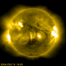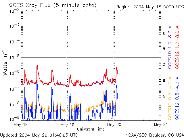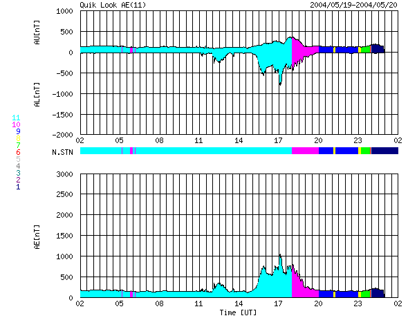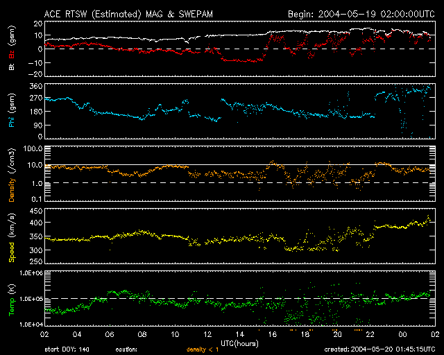 2004/ 5/20 10:47 更新 太陽風磁場の強度が強まっています。また、コロナホールのため速度も上昇を始めています。 担当 篠原 ACE衛星の観測によると、太陽風の磁場が強まって、10nTを超えて推移しています(白線)。 特に、19日21時〜20日1時(世界時19日13時〜16時)には 一時的に-10nTと大きく南を向いたため(赤線のマイナス成分)、短時間ですがオーロラ活動が活発になりました。 AE指数のグラフを見ると、 20日0時〜4時(世界時19日15時〜19時)にかけて最大1000nTに達する変動が現れています。 現在も磁場強度はとても強いですが、主に北を向いている(赤線がプラス方向にある)ため、磁気圏は穏やかです。 しかし、南北成分は今後も大きく振れる可能性があり、南を向いた場合には磁気圏が乱れる事が予想されます。 一方、コロナホールの影響と思われますが、太陽風の速度も緩やかに上昇を始めています。 340km/秒まで下がっていた太陽風の速度ですが、現在は400km/秒に上がっています。 400km/秒という値そのものは静穏レベルですが、今後の上昇には注意が必要でしょう。 SOHO EIT284の太陽画像には太陽の中央から下側にかけて薄暗い領域(コロナホール)が広がって見えています。 高速風の本体はこれから地球へ届きます。 ただし、コロナホールの規模を考えると、大きな速度の上昇は無いと思われます。 太陽では、東の端(左端)から活動的な領域が上りつつあります。 昨夜からCクラスの小規模フレアを2度ほど起こしています。 まだ向こう側に位置しているため、黒点の写真には見えていませんが、明日頃には見えて来るでしょう。 SOHO衛星のEIT284カメラの映像 (c) SOHO (ESA & NASA)