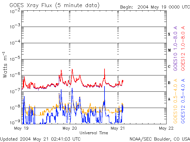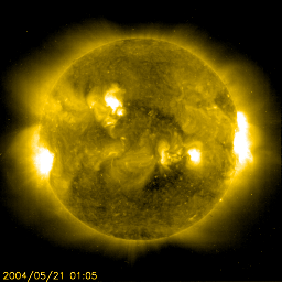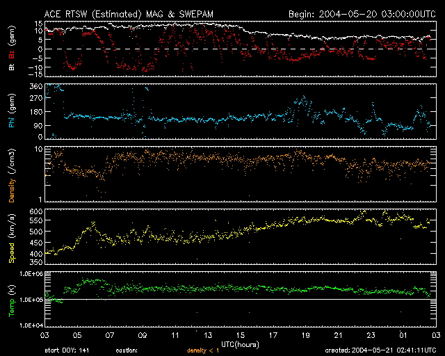 2004/ 5/21 11:41 更新 コロナホールのため、太陽風の速度は550km/秒に上昇しています。 担当 篠原 コロナホールの影響が強まっています。 太陽風の速度は昨日から緩やかに上昇を続け、550km/秒に達しています。 太陽風の磁場強度は速度の上昇に伴って、10nTから5nTへ弱まって来ました。 地球磁気圏へのエネルギー流入効率を決める太陽風磁場の南北成分(赤線)は正負に振れ続けています。 速度も上昇していますので、しばらくオーロラ活動が活発になる可能性があります。 昨日、20日19時(世界時20日10時)頃に太陽風の磁場が-10nTと強く南を向く時間帯がありました。 このため、一時的にオーロラ活動が強まり(AE指数を参照)、 沖縄でも磁場のやや大きな乱れが観測されています。 SOHO EIT284カメラの太陽画像では、 中心からやや下(南半球側)の部分にコロナホール(暗く見えている領域)が見えています。 この領域からの高速風がこれから引き続いて地球へ当たると思われますので、 高速風はもう3日ほど続くと思われます。 太陽のフレア活動は、Cクラスの小規模フレアが昨日のニュース以降1回起こった程度です。 一時にぎやかだった黒点群も減少しており、穏やかな状態が続きそうです。 新しく太陽の東縁(左縁)から黒点群が上って来ています。 この図には番号がまだ付いていませんが、618群となっています。 どのような黒点群か、今後の情報に注意して下さい。 SOHO衛星のEIT284カメラの映像 (c) SOHO (ESA & NASA)