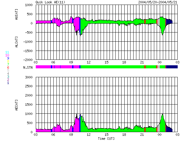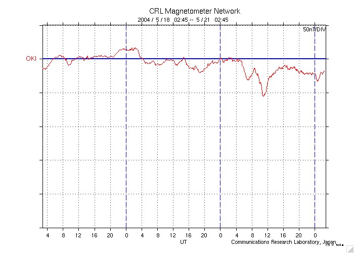 ACEが観測した太陽風の磁場(1番上の枠、白線は全体の強度、赤線は南北成分) および、太陽風の密度(3番目の橙線)、速度(4番目の黄線) (c) NOAA/SEC ![]() リアルタイムAE指数 下段のAEグラフの値が高くなると、オーロラ活動が活発化しています。 (c) 京都大学, NICT ![]() 沖縄の磁場擾乱 下へ下がるほど、擾乱が発達している事を意味します。 (c) NICT ![]() GOES衛星の太陽X線データ (c) NOAA/SEC ![]() SOHO衛星のMDIカメラによる太陽黒点 (c) SOHO (ESA & NASA) ![]() | ||||||||||||||||||||||||||||||||||||||||
