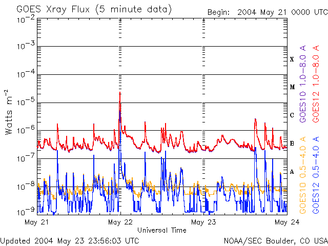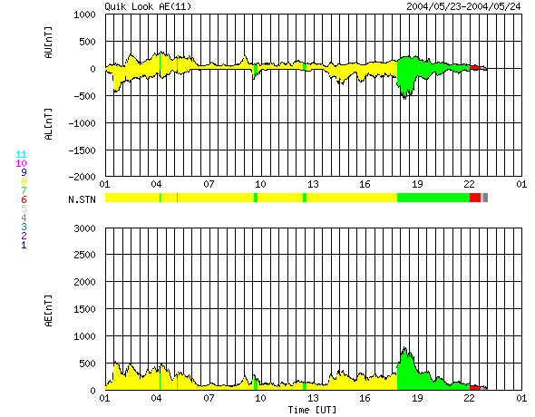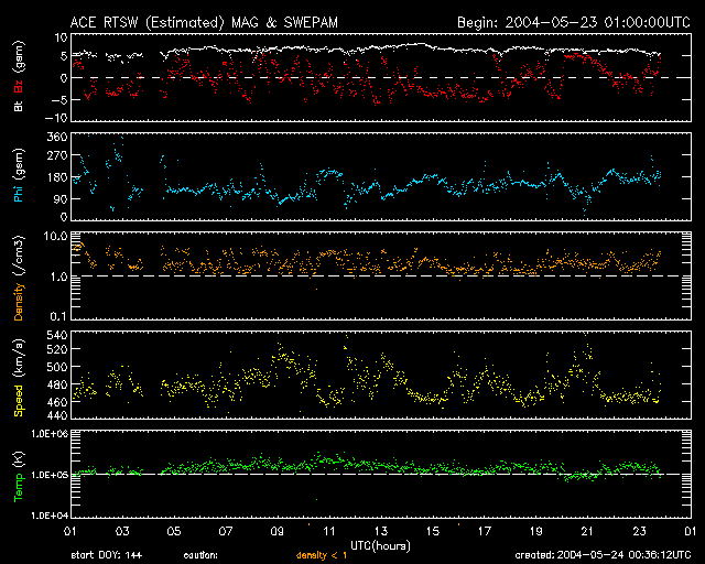 2004/ 5/24 09:35 更新 太陽風磁場の影響で、オーロラ活動がやや強まっています。 担当 篠原 太陽風の磁場が南北に激しく振れています。 このため、小規模ですがオーロラの活動が見られる様になっています。 オーロラの活動度を示すAE指数のグラフでは500nT前後の変化が度々現れています。 太陽風の速度は450km/秒を越える程度で、大きな値ではありません。 このため、オーロラの活動も限定的な規模になっていると思われます。 太陽風の磁場強度は現在も5nT程度ありますので、 今後も南を向く時間帯ではオーロラ活動が活発になるでしょう。 太陽面では、太陽黒点の618群がCクラスの小規模フレアを度々起こしています。 この黒点群は、Mクラスの中規模フレアを起こす可能性があるとのことですので、 現在の規模を保っている間は注意が必要でしょう。 放射線帯の高エネルギー電子は大きな増加には至っていません。 今回は、警戒域に達する事は無い様に思われます。 ACEが観測した太陽風の磁場(1番上の枠、白線は全体の強度、赤線は南北成分) および、太陽風の密度(3番目の橙線)、速度(4番目の黄線) (c) NOAA/SEC ![]() リアルタイムAE指数 下段のAEグラフの値が高くなると、オーロラ活動が活発化しています。 (c) 京都大学, NICT ![]() SOHO衛星のMDIカメラによる太陽黒点 (c) SOHO (ESA & NASA) ![]() GOES衛星の太陽X線データ (c) NOAA/SEC ![]() GOES衛星による、静止衛星軌道における高エネルギー電子の変化 (c) NOAA/SEC ![]() | |||||||||||||||||||||||||||||||||||||||