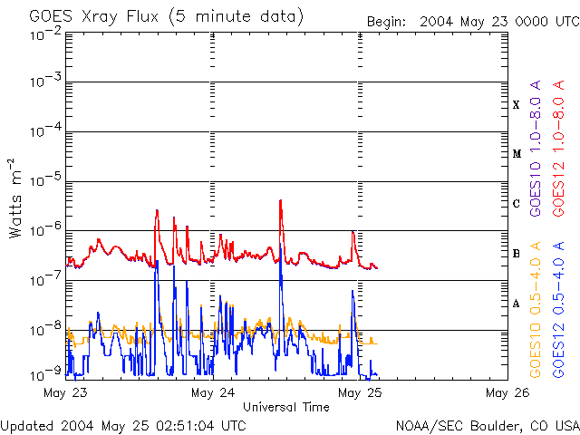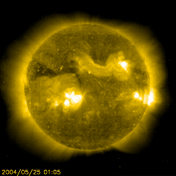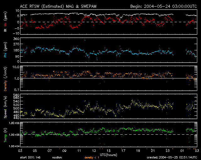 2004/ 5/25 11:53 更新 太陽風はやや高速の状態が続いています(500km/秒)。618黒点群が発達しています。 担当 篠原 カナダのサスカチュワン州サスカトゥーンから更新しています。 この街には、SuperDARN(スーパーダーン)と呼ばれる、 北極の電離圏を観測している大型レーダー群のひとつが設置されています。 この大型レーダー群は地球の北極域と南極域に極地を包み込む様に15カ所設置されています。 北極のレーダーの広がりを下図で紹介します。扇のひとつひとつがレーダーの観測域を示しています。 太陽風の速度は500km/秒で安定した状態が続いています(ACEの黄色線)。 コロナホールはかなり過ぎたと思われるのですが、意外に速度が低下していません。 磁場強度も5nTとやや強い状態が続いています(ACEの白線)。 このため、時々大きく南向きになって(赤線がマイナスに変化する)、 地球のオーロラ活動を活発にしています。 AE指数のグラフを見ると、24日16時・21時(世界時24日7時・12時)に1000nT近い活動が起きています。 ACEの太陽風データに戻ると、この時刻の前に大きく磁場が南を向いていた事が分かります。 この様なときに、太陽風から地球にオーロラを起こすエネルギーが注入されるのです。 太陽黒点の618群の規模が大きくなっています。 昨日もCクラスの小規模フレアを起こしました。 今後も中規模のフレアを起こす可能性がありますので、注意して下さい。 北極圏を覆う様に観測網を広げているSuperDARNのレーダー群。 (c) JHU/APL ![]() SOHO衛星のEIT284カメラの映像 (c) SOHO (ESA & NASA)