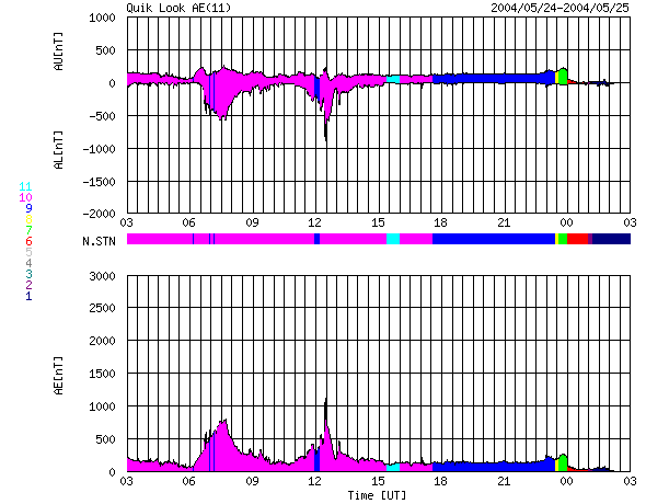 ACEが観測した太陽風の磁場(1番上の枠、白線は全体の強度、赤線は南北成分) および、太陽風の密度(3番目の橙線)、速度(4番目の黄線) (c) NOAA/SEC ![]() リアルタイムAE指数 下段のAEグラフの値が高くなると、オーロラ活動が活発化しています。 (c) 京都大学, NICT ![]() SOHO衛星のMDIカメラによる太陽黒点 (c) SOHO (ESA & NASA) ![]() GOES衛星の太陽X線データ (c) NOAA/SEC ![]() | ||||||||||||||||||||||||||||||||||||||||