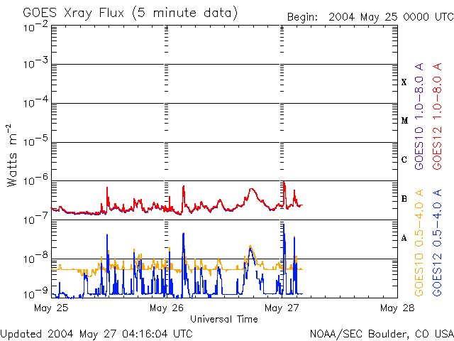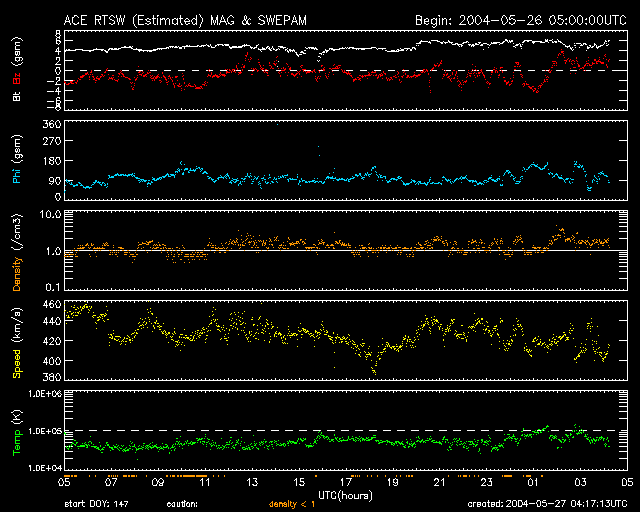 ACEが観測した太陽風の磁場(1番上の枠、白線は全体の強度、赤線は南北成分) および、太陽風の密度(3番目の橙線)、速度(4番目の黄線) (c) NOAA/SEC ![]() SOHO衛星のMDIカメラによる太陽黒点 (c) SOHO (ESA & NASA) ![]() GOES衛星の太陽X線データ (c) NOAA/SEC ![]() | ||||||||||||||||||||||||||||||||||||||||