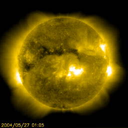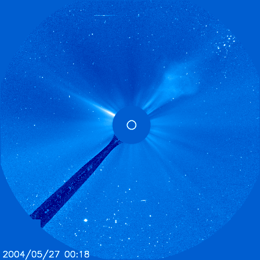 2004/ 5/27 13:20 更新 太陽風は低速で、磁気圏はたいへん穏やかです。フレア活動も穏やかです。 担当 篠原 太陽風は速度420km/秒まで下がっています。 磁気圏も穏やかです。 SOHO衛星のLASCO C3カメラに見えていたすばる(プレアデス星団)ですが、 すっかり写野の右上の端に来てしまいました。 ちょうど、太陽からガスのかたまりがすばるへ向かって吹き出しているのが見えます。 一方、画面の下にはヒアデス星団が見えています。 一番明るく見える星が一等星のアルデバランです。 ここを起点として右へやや明るい星を2つほど進み、そこから左上へ星を2,3個たどってできる 斜めのVの字がヒアデス星団です。 宇宙から見る春の風物詩も、また来年のお楽しみです。 SOHO EIT284カメラには、コロナホールが太陽の中心やや上に見えています。 昨日書きました様に、ここからの高速風の影響は弱いのではないかと思われます。 続いて、東端(左端)の赤道に新しいコロナホールが見えています。 1週間後過ぎるとこの影響で磁気圏が乱れるでしょう。 太陽黒点の618群は規模がやや縮小しています。 現在も中規模フレアを起こす可能性は残っているとのことですので、 もうしばらく注意が必要でしょう。 SOHO衛星LASCO C3カメラのプレアデス星団(すばる)とヒアデス星団 (c) ESA & NASA ![]() SOHO衛星のEIT284カメラの映像 (c) SOHO (ESA & NASA)