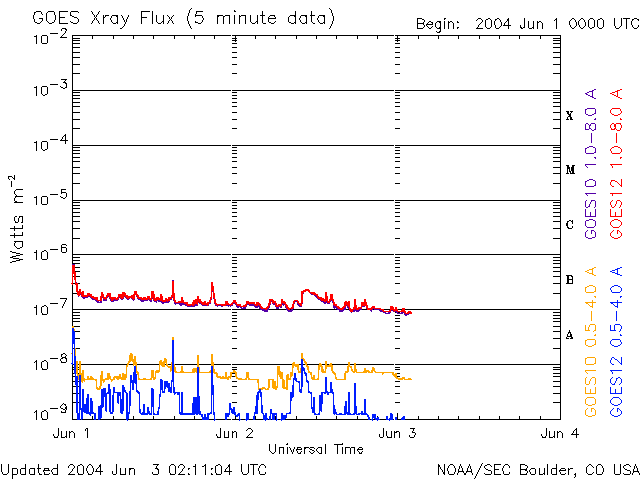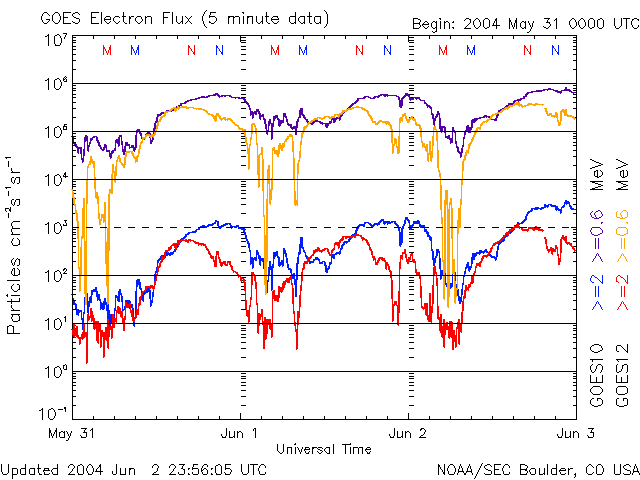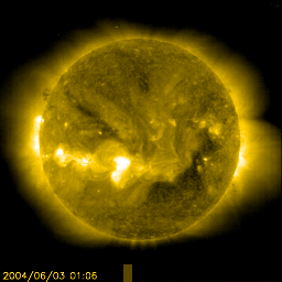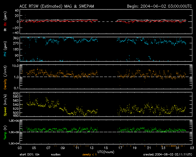 2004/ 6/ 3 11:13 更新 太陽風の速度は500km/秒へやや下がっています。放射線帯電子が増加しつつあります。 担当 篠原 昨日以降太陽風の速度は更に上昇する事はなく、500km/秒程度へやや下がっています。 SOHO EIT284に見えるコロナホール(暗く見えている領域)の位置から、 もう1〜2日程度高速風が続くと予想されます。 太陽風の磁場がたいへん見にくく表示されているのですが、 強度が5nT程度とやや強めですが、北寄りになっている様で、磁気圏の活動は目立ったものではありません。 AE指数も小規模の変動が見られる程度です。 一方、放射線帯の高エネルギー電子は順調に増加を続けています。 明後日頃に警戒域と言われる10の4乗の線に達するかもしれません。しばらく注意が必要です。 太陽黒点は目立った規模の物はなく、まばらに見える程度です。 来週の火曜日、6月8日14時から日本では130年ぶりという金星の太陽面通過が見られます。 通過するのに6時間かかるため途中で日没してしまうという、長時間の現象です。 大きな黒点が並んでいると見応えのある映像になるのですが、 このままでは寂しい太陽面を通過する事になりそうです。 Webによる画像の生中継が各地で計画されていますので、ぜひご覧下さい。 次回は8年後、その次は105年後だそうです。 参考:AstroArts 金星の日面通過 SOHO衛星のEIT284カメラの映像 (c) SOHO (ESA & NASA)