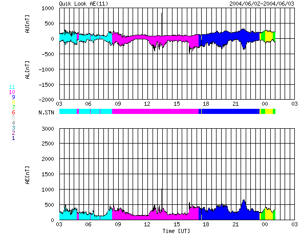 ACEが観測した太陽風の磁場(1番上の枠、白線は全体の強度、赤線は南北成分) および、太陽風の密度(3番目の橙線)、速度(4番目の黄線) (c) NOAA/SEC ![]() リアルタイムAE指数 下段のAEグラフの値が高くなると、オーロラ活動が活発化しています。 (c) 京都大学, NICT ![]() GOES衛星による、静止衛星軌道における高エネルギー電子の変化 (c) NOAA/SEC ![]() SOHO衛星のMDIカメラによる太陽黒点 (c) SOHO (ESA & NASA) ![]() GOES衛星の太陽X線データ (c) NOAA/SEC ![]() | ||||||||||||||||||||||||||||||||||||||||