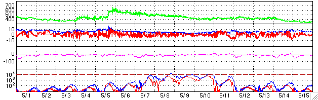 ACEが観測した太陽風の磁場(1番上の枠、白線は全体の強度、赤線は南北成分) および、太陽風の密度(3番目の橙線)、速度(4番目の黄線) (c) NOAA/SEC ![]() 27日の太陽周期に合わせたデータプロット (放射線帯電子版) 太陽が同じ面を地球に向けていた27日前の変化から、今後を予想することができます。 (c) NICT