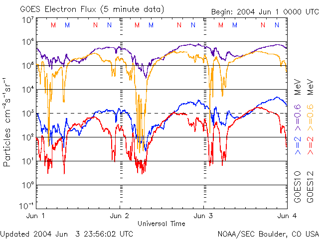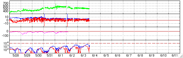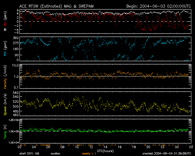 2004/ 6/ 4 10:40 更新 太陽風の速度は緩やかに低下を続けています。一時的にオーロラの活動が高まっています。 2004/ 6/ 4 10:50 追加 8日に太陽面を通過する金星が、LASCO C3画像に現れました。 担当 篠原 コロナホールも遠ざかり、太陽風の速度は緩やかに低下を続けています。 昨日は520km/秒でしたが、現在は480km/秒まで下がっています。 今後を展望するために、27日周期の図をご覧下さい。 緑の線が太陽風の速度を示しています。 この数日間、27日前の前周期とほぼ同様の変化を示していたことが分かります。 この図より、太陽風の速度は今後2日ほどかけて更に400km/秒へと下がって行くことでしょう。 数日前からお知らせしていましたが、放射線帯の高エネルギー電子が増加を続けています。 この変化もまた前周期のデータの中に見る事ができます。 一番下の欄が電子の密度変化を示した図です。 今回と27日前が良く似た変化を見せています。 これによると、明日以降警戒ライン(赤の破線)に達しそうです。 衛星の運用では注意が必要となります。 ACE衛星の太陽風データにもどります。 磁場データ(一番上の欄)が急に南北に激しく振動を始めました(赤線が上下に振れている)。 このため、オーロラ活動がやや活発になっています。 AE指数のグラフではその変化が観測されつつあります(グラフの最後の500nTの変化)。 この太陽風の変化が続く間、オーロラ活動もやや活発な状態が続くでしょう。 太陽面は黒点群も小さく、フレア活動は穏やかです。 2004/ 6/ 4 10:50 追加 (篠原) 関連の図はページの最後にあります 8日に太陽面を通過する金星が、LASCO C3画像にその姿を現しました。 これから4日かけて太陽へ近づきます。 この他様々な太陽観測機器が日面通過現象を捉える事になりそうです。 宇宙天気現象ではありませんが、注目したいと思っています。 SOHO衛星のEIT284カメラの映像 (c) SOHO (ESA & NASA)