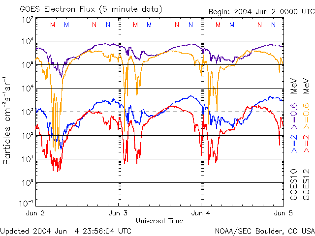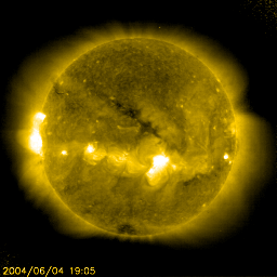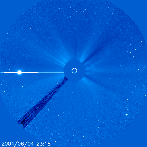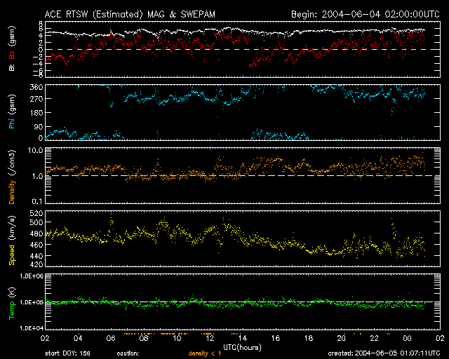 2004/ 6/ 5 10:08 更新 太陽風速度は低下を続け、磁気圏は穏やかです。放射線帯電子の増加も止まりました。 担当 篠原 今日1枚めの写真は、太陽面通過へ向かう金星です。 太陽観測衛星のSOHO衛星LASCO C3カメラが捉えた映像です。 これから3日かけて、いよいよ太陽の前を横切ります。 参考:アストロアーツ・金星の日面通過 太陽風の速度は450km/秒まで下がっています。 このため、磁気圏は穏やかになっています。 ただし、太陽風の磁場強度は5nTを越える程度ありますので、 南を向くとオーロラ活動がやや活発になる可能性があります。 SOHO EIT284カメラの太陽画像では、中央付近に小さなコロナホールが見えているだけです。 今後しばらく高速太陽風の心配は無いでしょう。 太陽の東縁(左端)が明るく輝いています。 新しい活動領域が上りつつある様です。この領域に見えているであろう黒点群の規模に注目です。 太陽面は非常に穏やかで、黒点がほとんど見えなくなっています。 放射線帯の高エネルギー電子の増加はほぼ止まった様です。 警戒域に達する事はありませんでした。 SOHO衛星LASCO C3カメラが捉えた、日面通過へ向かう金星。 (c) ESA & NASA ![]() SOHO衛星のEIT284カメラの映像 (c) SOHO (ESA & NASA)
