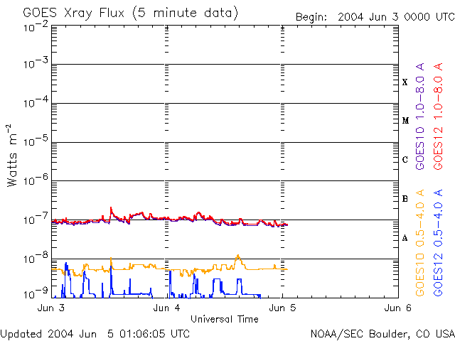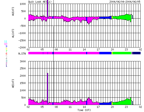 ACEが観測した太陽風の磁場(1番上の枠、白線は全体の強度、赤線は南北成分) および、太陽風の密度(3番目の橙線)、速度(4番目の黄線) (c) NOAA/SEC ![]() リアルタイムAE指数 下段のAEグラフの値が高くなると、オーロラ活動が活発化しています。 (c) 京都大学, NICT ![]() SOHO衛星のMDIカメラによる太陽黒点 (c) SOHO (ESA & NASA) ![]() GOES衛星の太陽X線データ (c) NOAA/SEC ![]() GOES衛星による、静止衛星軌道における高エネルギー電子の変化 (c) NOAA/SEC ![]() | ||||||||||||||||||||||||||||||||||||||||