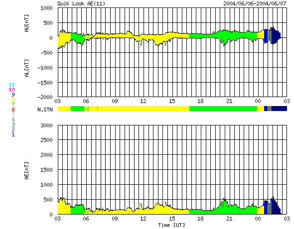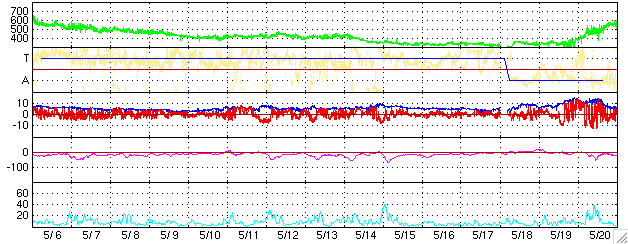 SOHO衛星のMDIカメラによる太陽黒点 (c) SOHO (ESA & NASA) ![]() GOES衛星の太陽X線データ (c) NOAA/SEC ![]() ACEが観測した太陽風の磁場(1番上の枠、白線は全体の強度、赤線は南北成分) および、太陽風の密度(3番目の橙線)、速度(4番目の黄線) (c) NOAA/SEC ![]() リアルタイムAE指数 下段のAEグラフの値が高くなると、オーロラ活動が活発化しています。 (c) 京都大学, NICT ![]() 27日の太陽周期に合わせたデータプロット (太陽風版) 太陽が同じ面を地球に向けていた27日前の変化から、今後を予想することができます。 (c) NICT