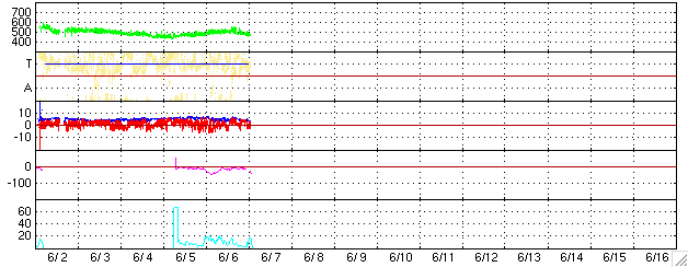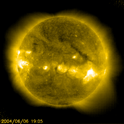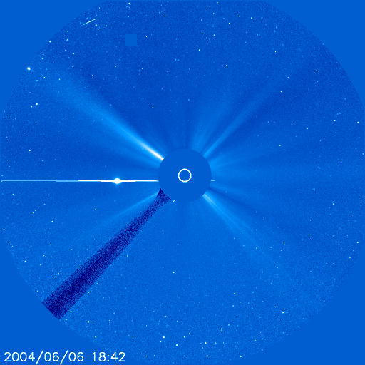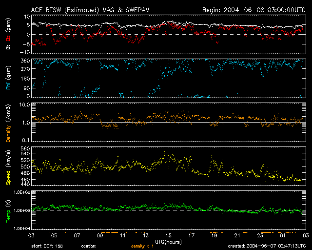 2004/ 6/ 7 11:49 更新 太陽風速度は静穏レベルです。磁気圏も静穏です。 担当 篠原 金星が更に太陽に接近しています。しかし、天候は全国的に厳しそうです。 明日は各地でWeb放送が計画されています。 せめて日本のどこかが晴れてくれれば、Webで日面通過を見る事ができるかもしれません。 太陽黒点は現在も大変少なく、金星の日面通過を飾る事は無さそうです。 フレア活動は穏やかです。 参考: ライブ・ユニバース AstroArts・金星の日面通過(インターネット中継局のリストが掲載されています) ACE衛星の観測によると、太陽風の速度が昨日一時的に500km/秒へ上昇していました。 SOHO EIT284カメラに小さく見えていたコロナホールの影響が及んでいるのかもしれません。 現在は460km/秒へ下がっています。 磁気圏は静穏です。 SOHO EIT284カメラでは大きなコロナホールは見られず、これからも穏やかな状態が続きそうです。 しかし、27日周期の図をご覧下さい。 前周期の太陽風磁場(赤・青線)を見ると、 今日に相当する5月11日から15日にかけて磁場が大きく南北に変化して、 オーロラ活動をやや活発にしていた(水色線)事が分かります。 この傾向が今回も見られた場合、オーロラが活発になる可能性があります。 今後4日程、太陽風磁場に注意が必要でしょう。 SOHO衛星LASCO C3カメラが捉えた、日面通過へ向かう金星。 (c) ESA & NASA ![]() SOHO衛星のEIT284カメラの映像 (c) SOHO (ESA & NASA)