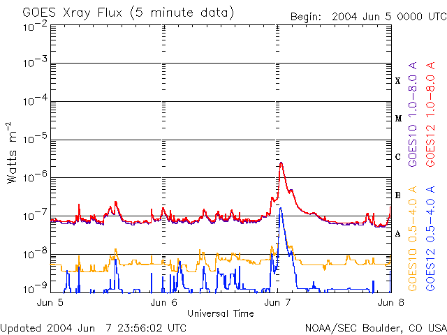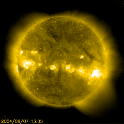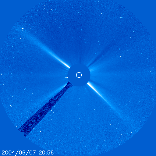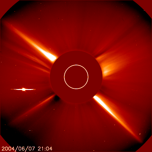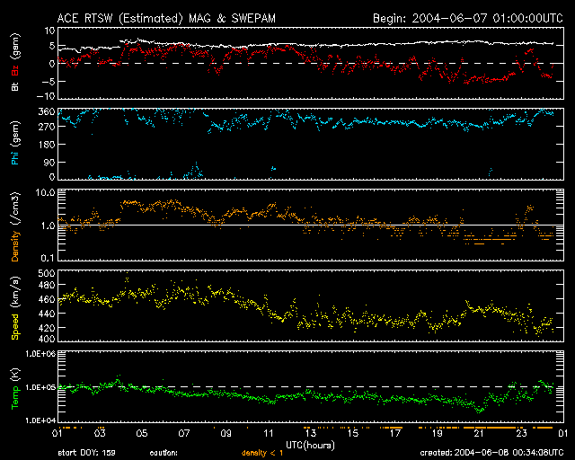 2004/ 6/ 8 09:36 更新 今日、金星の日面通過が見られます。太陽風磁場の変動に注意が必要です。 担当 篠原 宇宙天気現象ではありませんが、今日14時頃から金星の日面通過が世界的に観測されます。 LASCO C3カメラでは、とうとう金星が遮蔽板に隠れてしまいました。 もう一段太陽に近いLASCO C2でよく見えています。 金星は、太陽の南端をゆっくりと6時間かけて通過します。 日本では通り抜ける前に日没になってしまいます。 地上の天気予報が良くない様で、観測が心配されます。 観測情報:AstroArts・金星の日面通過(ライブ中継局も紹介されています) 宇宙天気観測機器の中には宇宙から太陽を観測しているものもあります。 リアルタイムでデータが公開されているものも多いですので、宇宙から日面通過を観測するのも良いかもしれません。 SOHO衛星リアルタイム画像 では、最新画像の一覧を見る事ができます。 LASCO C2で接近の様子を見る事ができます。 太陽通過中はEIT195が更新頻度が高く、観望に適している様です。 静止軌道にある米国の気象衛星GOESのX線画像もあります。太陽の見え方が地味ですが、 静止画像ページ(写真をクリックすると大きくなります) 動画のページ(2列目のJavaAppletまたはJavaScriptをクリックして、 新しいページのLoopボタンを押してしばらく待って下さい) 122年ぶりの珍しい現象です。どうぞお楽しみください。 太陽風の速度は440km/秒に下がっています。コロナホールの影響は抜けきった様です。 太陽風磁場は5nTとやや強めで、現在大きく南向き成分を持っています。 昨日のニュースでお知らせした状況が現れている様です。 このため、AE指数がかなり大きく変化しています。 太陽風から多くのエネルギーが地球磁気圏に流れ込んでいる事を示しています。 現時点ではオーロラの活発化には至っていない様ですが、今後もやや活発になる可能性があります。 これから3日程度注意が必要でしょう。 太陽は穏やかです。黒点群も目立つものはありません。日面通過にとってはやや寂しいですね。 SOHO衛星LASCO C3カメラが捉えた、日面通過へ向かう金星。 (c) ESA & NASA ![]() SOHO衛星LASCO C2カメラが捉えた、日面通過へ向かう金星。 (c) ESA & NASA ![]() SOHO衛星のEIT284カメラの映像 (c) SOHO (ESA & NASA)