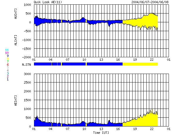 ACEが観測した太陽風の磁場(1番上の枠、白線は全体の強度、赤線は南北成分) および、太陽風の密度(3番目の橙線)、速度(4番目の黄線) (c) NOAA/SEC ![]() リアルタイムAE指数 下段のAEグラフの値が高くなると、オーロラ活動が活発化しています。 (c) 京都大学, NICT ![]() GOES衛星の太陽X線データ (c) NOAA/SEC ![]() SOHO衛星のMDIカメラによる太陽黒点 (c) SOHO (ESA & NASA) ![]() | ||||||||||||||||||||||||||||||||||||||||