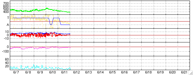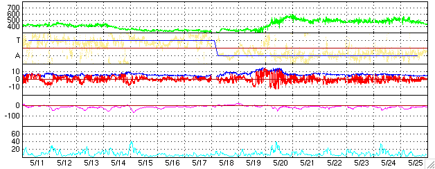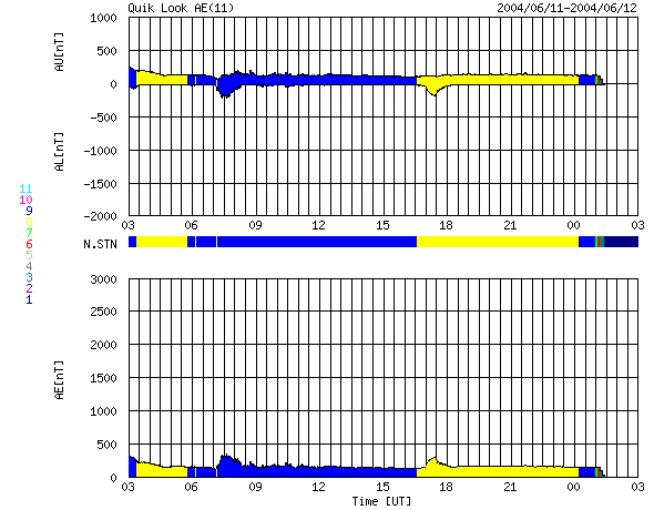 ACEが観測した太陽風の磁場(1番上の枠、白線は全体の強度、赤線は南北成分) および、太陽風の密度(3番目の橙線)、速度(4番目の黄線) (c) NOAA/SEC ![]() リアルタイムAE指数 下段のAEグラフの値が高くなると、オーロラ活動が活発化しています。 (c) 京都大学, NICT ![]() 27日の太陽周期に合わせたデータプロット (太陽風版) 太陽が同じ面を地球に向けていた27日前の変化から、今後を予想することができます。 (c) NICT
