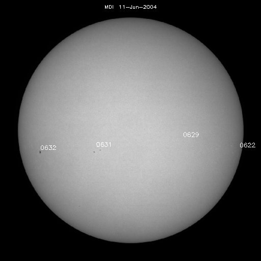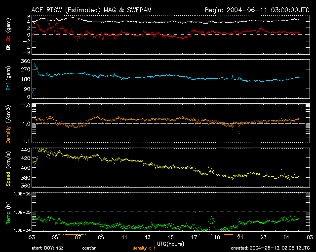 2004/ 6/12 11:08 更新 太陽風磁場のセクター境界を越えました。磁気圏は静穏です。 担当 篠原 11日の午前中に太陽風磁場のセクター境界を越えた様です。 地球は太陽から流れて来るプラズマの風(太陽風)の中に浮かんでいます。 太陽風の中には磁場があり、その磁場が大まかに地球から太陽を向いている領域と、 太陽から地球を向いている領域とに分けられます。 昨日までは、地球から太陽の方向を向いている太陽風の領域に入っていたのですが、 境界を越えて、太陽から地球を向いている領域に移りました。 境界を越えると太陽風の状況が急に変わる事があり、注意を要するのですが、 現在は太陽風は大変穏やかで、磁気圏も静かです。 SOHO EIT284カメラの太陽画像を見ると、昨日までははっきりと見えていなかったのですが、 太陽の中心からやや下寄りに小さなコロナホールが見えています。 16日頃にこのコロナホールの影響が見られると予想されます。 昨日も解説しましたが、27日周期の図をご覧下さい。 セクターの切り替わり(2列めの青線)が前周期より3日早まっています。 前周期ではセクターの切り変わりと、その後の500km/秒程度の高速風(1列めの緑線)の間に、 太陽風磁場が大きく乱れる期間がありました(3列めの赤線・青線)。 今周期にこの擾乱がどう現れるか注目されます。 太陽黒点はちらちらと小規模群が見えている程度です。 X線データではフレア活動も見られず、穏やかな状態が続いています。 SOHO衛星のEIT284カメラの映像 (c) SOHO (ESA & NASA)