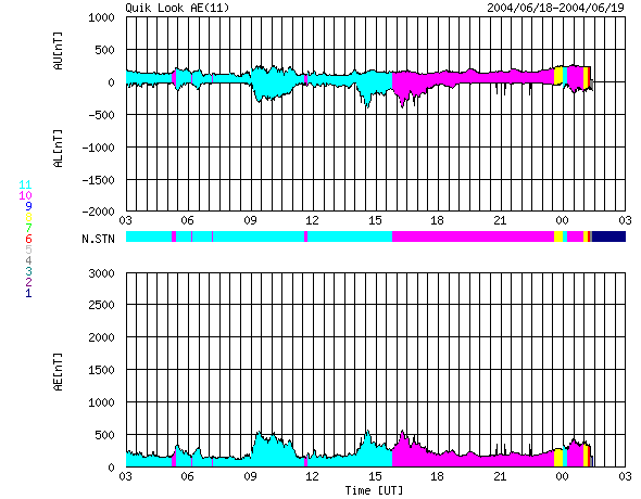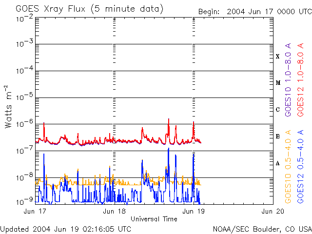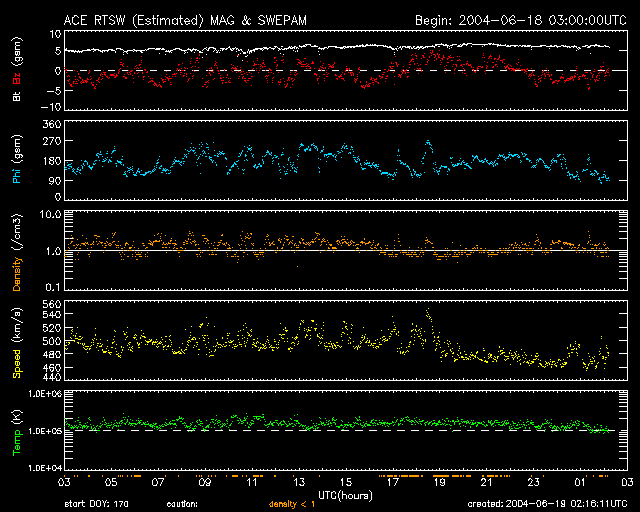 2004/ 6/19 11:18 更新 635黒点群が発達を続けています。太陽風の速度はやや下がっています。 担当 篠原 太陽面で黒点群の635群が発達しています。 黒点の写真を見ると、黒点の分布が複雑になっています。 これは黒点群がエネルギーを蓄えている事を示していて、 フレア(太陽爆発)の可能性が高まっていると考えられます。 634群と635群は昨日、Cクラスの小規模フレアを起こしてますが、 引き続きMクラスの中規模フレアを発生させる可能性があります。 太陽風はやや速度を下げ、480km/秒になっています。 AE指数には500nT程度の小規模なオーロラ活動が度々見えていますが、 磁気圏は概ね静穏だったと言えます。 これからもしばらくこの様な状態が続くと予想されます。 次第に太陽風の速度は下がり、磁気圏はさらに静かになって行くでしょう。 SOHO衛星のMDIカメラによる太陽黒点 (c) SOHO (ESA & NASA) ![]() GOES衛星の太陽X線データ (c) NOAA/SEC ![]() ACEが観測した太陽風の磁場(1番上の枠、白線は全体の強度、赤線は南北成分) および、太陽風の密度(3番目の橙線)、速度(4番目の黄線) (c) NOAA/SEC ![]() リアルタイムAE指数 下段のAEグラフの値が高くなると、オーロラ活動が活発化しています。 (c) 京都大学, NICT ![]() | |||||||||||||||||||||||||||||||||||||||