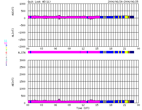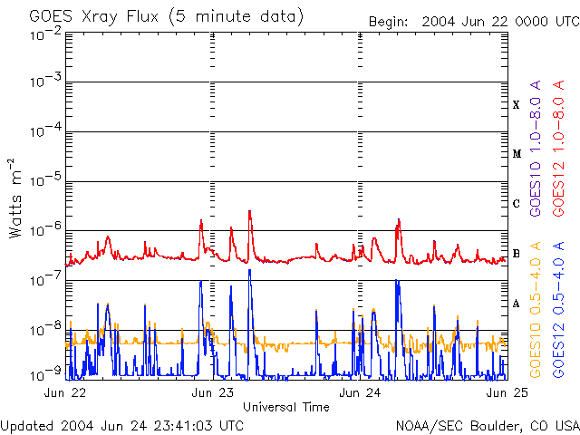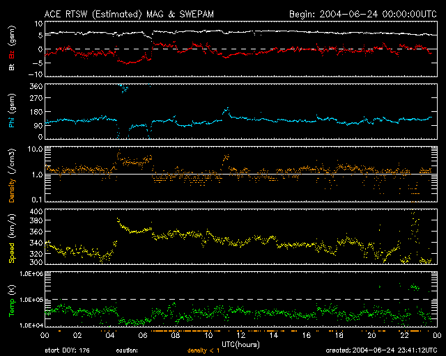 2004/ 6/25 08:41 更新 太陽風は300km/秒と非常に低速です。磁気圏もたいへん静かです。 担当 篠原 太陽風速度は現在もたいへん低速で、300km/秒まで下がっています。 磁場の強度も5nT前後で安定しています。 太陽風の速度が遅いため、磁気圏もとても穏やかな状態が続いています。 太陽が同じ面を地球に向けていた27日前のデータを参考にすると、 太陽風磁場のセクター境界がそろそろ来ると思われます。 それに続いて太陽風磁場が大きく乱れる可能性があります。 また、27日頃からコロナホールの影響で太陽風の速度が上昇を始めると思われます。 大きな擾乱にはならないと思われますが、磁気圏がしばらく活動的になるでしょう。 太陽面で大きな姿を見せていた、634、635黒点群が西に没しつつあります。 635群はまだ規模を保っており、小規模フレアを起こす事が予想されています。 ACEが観測した太陽風の磁場(1番上の枠、白線は全体の強度、赤線は南北成分) および、太陽風の密度(3番目の橙線)、速度(4番目の黄線) (c) NOAA/SEC ![]() リアルタイムAE指数 下段のAEグラフの値が高くなると、オーロラ活動が活発化しています。 (c) 京都大学, NICT ![]() SOHO衛星のMDIカメラによる太陽黒点 (c) SOHO (ESA & NASA) ![]() GOES衛星の太陽X線データ (c) NOAA/SEC ![]() | |||||||||||||||||||||||||||||||||||||||