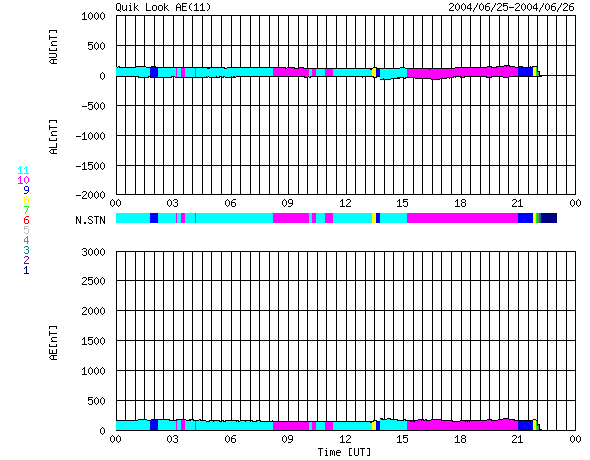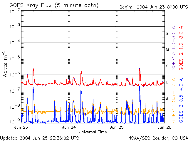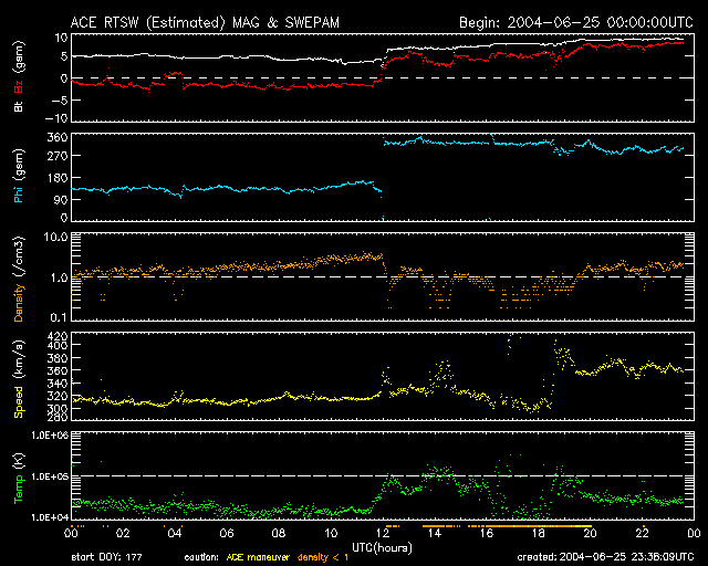 2004/ 6/26 08:40 更新 太陽風磁場のセクター境界を越え、磁場の様子が変化しています。磁気圏は静穏です。 担当 篠原 25日21時(世界時25日12時)に太陽風磁場のセクター境界を越えました。 ACE衛星のデータ、2列めの水色の線をご覧下さい。 データが飛んでいる様に見えますが、ここで太陽風磁場の方向が逆転し、 太陽→地球方向から地球→太陽方向へ切り替わりました。 それと共に、磁場強度(1列めの白線)、南北成分(1列めの赤線)の様子も変化しています。 磁場強度は強まり、10nT近くに達しています。 南北成分は北寄りが強まっています。 境界を越えた後の磁場が北寄りだったため、 磁場が強まりましたが磁気圏の擾乱には影響していません(AE指数のグラフ)。 速度は低いままです。やや上がっていますが、360km/秒と低い速度です。 ただし、明日以降、コロナホールのために太陽風の速度は上昇すると予想されます。 太陽黒点の635群は昨日もCクラスの小規模フレアを起こしました。 間もなく西の端に沈んで行くでしょう。 完全に没するまでは中規模フレアに対する注意が必要です。 ACEが観測した太陽風の磁場(1番上の枠、白線は全体の強度、赤線は南北成分) および、太陽風の密度(3番目の橙線)、速度(4番目の黄線) (c) NOAA/SEC ![]() リアルタイムAE指数 下段のAEグラフの値が高くなると、オーロラ活動が活発化しています。 (c) 京都大学, NICT ![]() GOES衛星の太陽X線データ (c) NOAA/SEC ![]() | |||||||||||||||||||||||||||||||||||||||