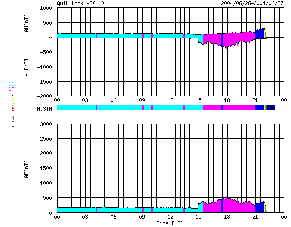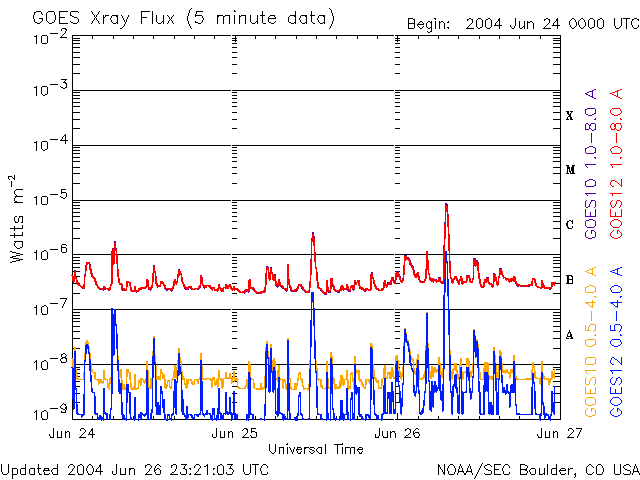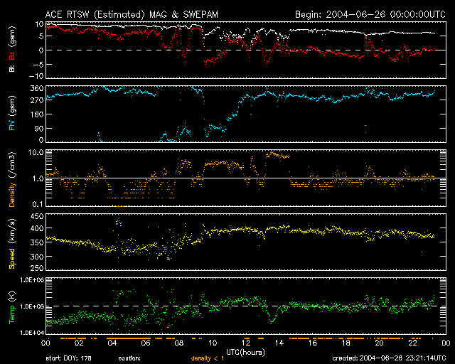 2004/ 6/27 08:21 更新 C8.6の小規模フレアが発生しました。これから太陽風速度が上昇すると予想されます。 担当 篠原 26日16時(世界時26日7時)にC8.6とやや大きな小規模フレアが発生しました。 発生箇所は635黒点群で、西没前にひとつ大きな活動を起こしました。 黒点群としての規模は縮小しており、今後の大きな活動の可能性は下がっています。 このフレアによるCMEの発生はSOHOの観測が無いため分かりませんが、 太陽の端で起きていますので、発生していた場合でも地球への影響は小さいでしょう。 ACE衛星の観測によると、 26日18時(世界時26日9時)頃から太陽風の速度が400km/秒に上昇しています。 この値は通常の太陽風速度です。 オーロラ活動の指数であるAE指数を見ると、 27日0時(世界時26日15時)頃からオーロラ活動がやや活動的になっています。 太陽風磁場には弱い南よりの傾向が見られますが、対応ははっきりしません。 コロナホールの影響でこれから徐々に太陽風の速度が上昇すると予想されます。 同じコロナホールの影響が見られた27日前には、約600km/秒まで上昇しました。 ACEが観測した太陽風の磁場(1番上の枠、白線は全体の強度、赤線は南北成分) および、太陽風の密度(3番目の橙線)、速度(4番目の黄線) (c) NOAA/SEC ![]() リアルタイムAE指数 下段のAEグラフの値が高くなると、オーロラ活動が活発化しています。 (c) 京都大学, NICT ![]() GOES衛星の太陽X線データ (c) NOAA/SEC ![]() | |||||||||||||||||||||||||||||||||||||||