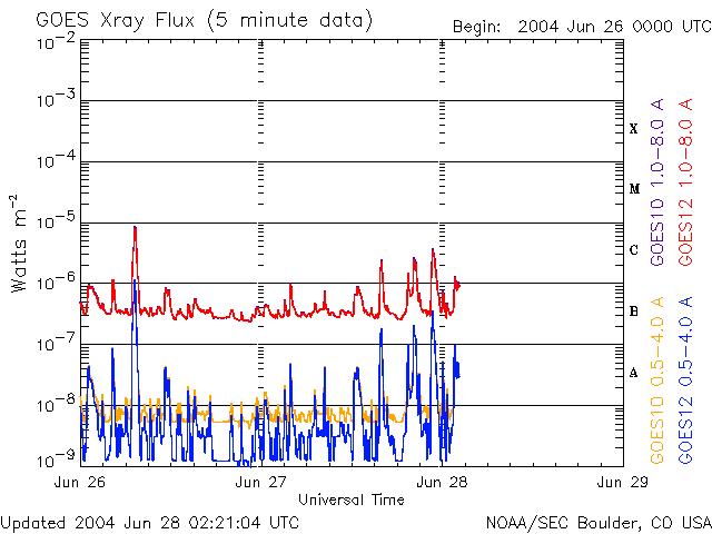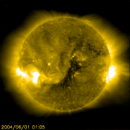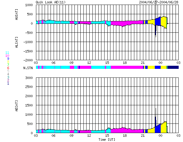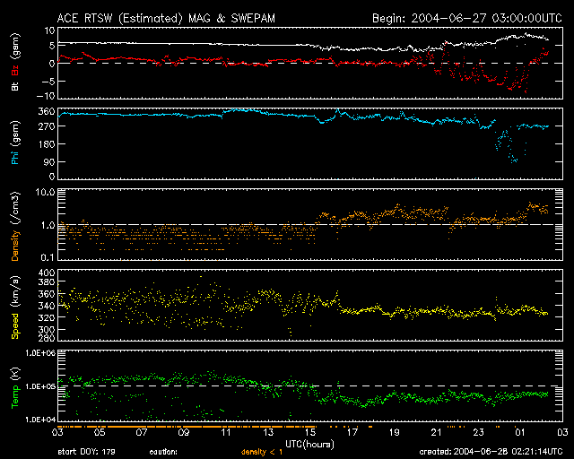 2004/ 6/28 11:21 更新 太陽風磁場の強度に変化が見えています。これから太陽風の速度が上昇すると思われます。 担当 篠原 まだ高速風は来ていません。昨日のニュース以降、太陽風の速度は340km/秒まで下がりました。 太陽風の磁場強度も5nT程度に下がったのですが、28日6時(世界時27日21時)頃から再び強まり始め、 また、急に大きく南を向く様になりました。 この磁場強度の上昇は、太陽風速度上昇の前触れの可能性もあります。 SOHO EIT284カメラの観測が休止していますので、参考として27日前(6月1日)の太陽画像を表示します。 太陽中心のやや下寄りに大きなコロナホールが広がっています。 現在もこの付近にコロナホールが広がっていると思われます。 ここから吹き出している速度の速い太陽風がやがて地球に届くと思われます。 太陽風磁場の南向きの影響で、AE指数の乱れも急に大きくなっています。 太陽風の速度が遅いため、AE指数の変化は比較的小さな規模に留まっていますが、 速度が上昇すると、擾乱の規模も大きくなり易くなります。 太陽黒点の635群はいよいよ太陽の西の端に没しつつあります。 Cクラスの小規模フレアに留まっていますが、635群はここへ来て活発に活動を続けています。 SOHO衛星のEIT284カメラの映像 (c) SOHO (ESA & NASA)