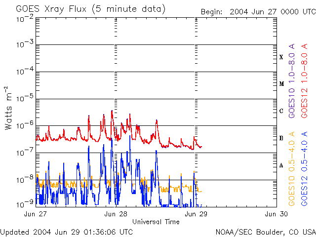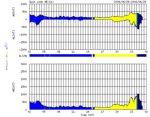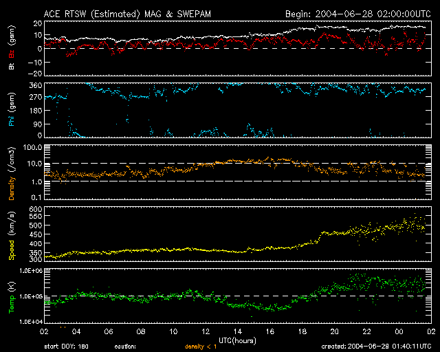 2004/ 6/29 10:41 更新 コロナホールによる高速風領域に入りました。太陽風速度が500km/秒に上昇しています。 担当 篠原 コロナホールの影響域に入った様です。 ACE衛星の観測では、29日4時(世界時28日19時)頃から太陽風の速度が上昇を始め、 現在500km/秒に達しています。 高速風はもうしばらく上昇を続け、600km/秒程度に達するという予想が出されています。 前周期の変化やコロナホールの規模から考えると、上昇を続けてもその程度の速度に留まるでしょう。 太陽風の磁場強度も15nTまで上昇しています(ACEデータの白線)。 南向き成分(赤線のマイナス成分)はあまり含まれていないのですが、 AE指数を見ると、500〜1000nT程度の変化が観測されており、オーロラは活発化している様です。 前周期の変化を参考にすると、高速風は3日程度続きそうです。 太陽黒点では635群がとうとう見えなくなりました。 現在は大きな黒点群も無く、太陽フレアも小規模フレアが発生する程度でしょう。 ACEが観測した太陽風の磁場(1番上の枠、白線は全体の強度、赤線は南北成分) および、太陽風の密度(3番目の橙線)、速度(4番目の黄線) (c) NOAA/SEC ![]() リアルタイムAE指数 下段のAEグラフの値が高くなると、オーロラ活動が活発化しています。 (c) 京都大学, NICT ![]() SOHO衛星のMDIカメラによる太陽黒点 (c) SOHO (ESA & NASA) ![]() GOES衛星の太陽X線データ (c) NOAA/SEC ![]() | |||||||||||||||||||||||||||||||||||||||