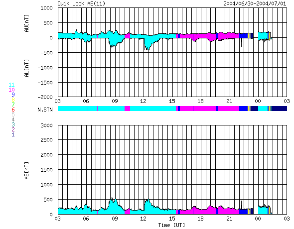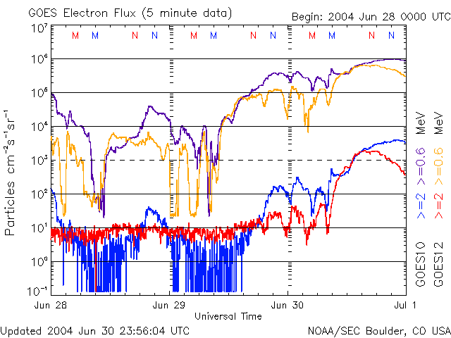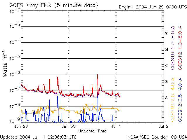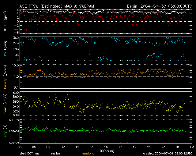 2004/ 7/ 1 11:06 更新 太陽風はやや高速(530km/秒)です。放射線帯電子が増加しています。 担当 篠原 ACE衛星の観測によると、太陽風の速度は現在も530km/秒とやや高速です。 磁場強度は約5nT。北寄りが続いています。 オーロラ活動の指標であるAE指数を見ると、小さな活動が数回見られていますが、活動度は低下しています。 高速太陽風はこれから次第に低下していくでしょう。 磁気圏内では大きな乱れは発生せず、静かな状態が続くと思われます。 一方で、放射線帯の高エネルギー電子の密度が増加を始めています。 GOES衛星の観測によると、電子密度は10の3乗の線を越えています。 この密度が10の4乗を越えると、衛星の運用などで障害が発生し易くなると言われています。 今後もうしばらく増加が続く可能性があり、注意が必要です。 太陽のフレア活動は穏やかです。 昨日、小さなCクラスの小規模フレアが1度起こりましたが、目立った活動領域はなく、 このまま穏やかでしょう。 ACEが観測した太陽風の磁場(1番上の枠、白線は全体の強度、赤線は南北成分) および、太陽風の密度(3番目の橙線)、速度(4番目の黄線) (c) NOAA/SEC ![]() リアルタイムAE指数 下段のAEグラフの値が高くなると、オーロラ活動が活発化しています。 (c) 京都大学, NICT ![]() GOES衛星による、静止衛星軌道における高エネルギー電子の変化 (c) NOAA/SEC ![]() GOES衛星の太陽X線データ (c) NOAA/SEC ![]() SOHO衛星のMDIカメラによる太陽黒点 (c) SOHO (ESA & NASA) ![]() | |||||||||||||||||||||||||||||||||||||||