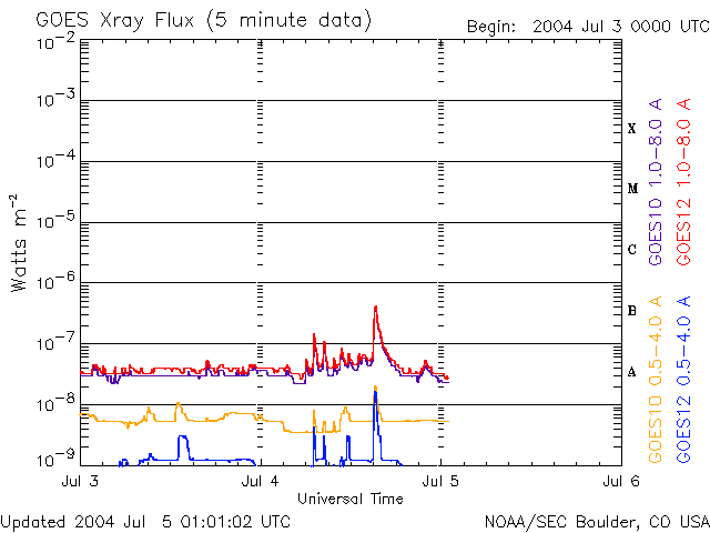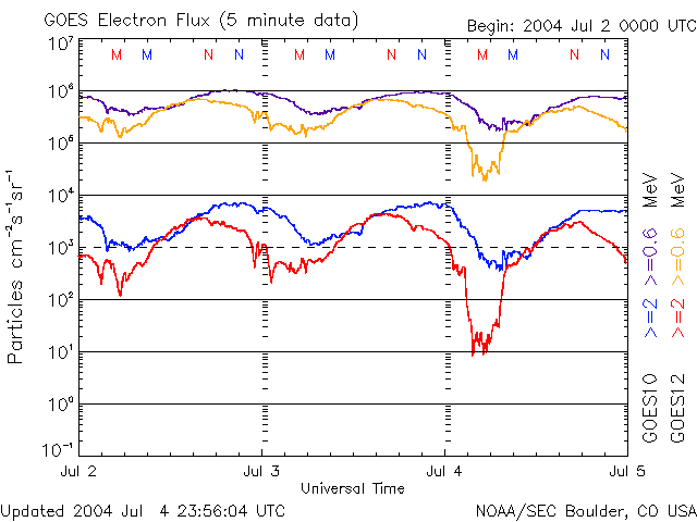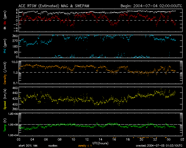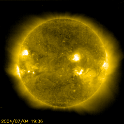 2004/ 7/ 5 10:05 更新 太陽風は速度420km/秒で静穏レベルです。磁気圏も静かです。 担当 篠原 太陽風の速度は420km/秒で安定しています。 磁場も強度が4nTと通常のレベルで、北寄りが主です。 磁気圏は穏やかで、オーロラ活動はほとんど見られません(AE指数を参照)。 SOHO EIT284の太陽画像が久しぶりに得られています。 太陽は全面のっぺりした感じで、コロナホールは見られません。 太陽風はこのまま穏やかな状態が続くでしょう。 放射線帯の高エネルギー電子は減少の傾向を見せています。 警戒域に達するまでの発達はありませんでした。 太陽でも、小さな黒点群が見えるのみで、たいへん穏やかです。 フレア活動もほとんどありません。 ただいま、シンガポールに来ています。 アジア地域を中心とした宇宙天気研究の学会が開かれています。 SOHO衛星のEIT284カメラの映像 (c) SOHO (ESA & NASA)