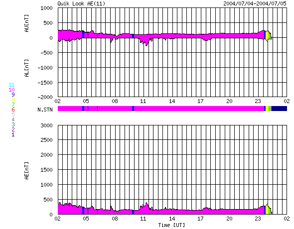 ACEが観測した太陽風の磁場(1番上の枠、白線は全体の強度、赤線は南北成分) および、太陽風の密度(3番目の橙線)、速度(4番目の黄線) (c) NOAA/SEC ![]() リアルタイムAE指数 下段のAEグラフの値が高くなると、オーロラ活動が活発化しています。 (c) 京都大学, NICT ![]() GOES衛星による、静止衛星軌道における高エネルギー電子の変化 (c) NOAA/SEC ![]() SOHO衛星のMDIカメラによる太陽黒点 (c) SOHO (ESA & NASA) ![]() GOES衛星の太陽X線データ (c) NOAA/SEC ![]() | ||||||||||||||||||||||||||||||||||||||||