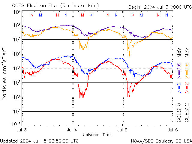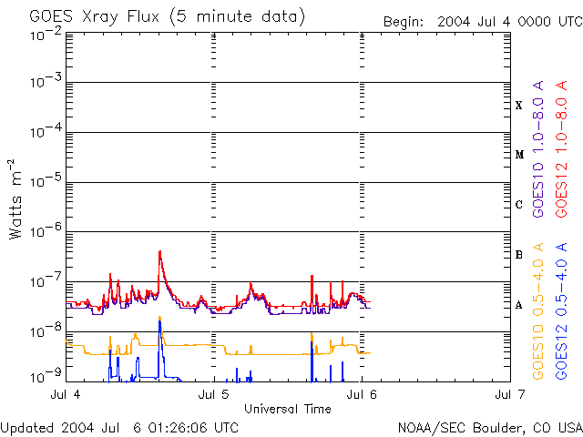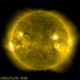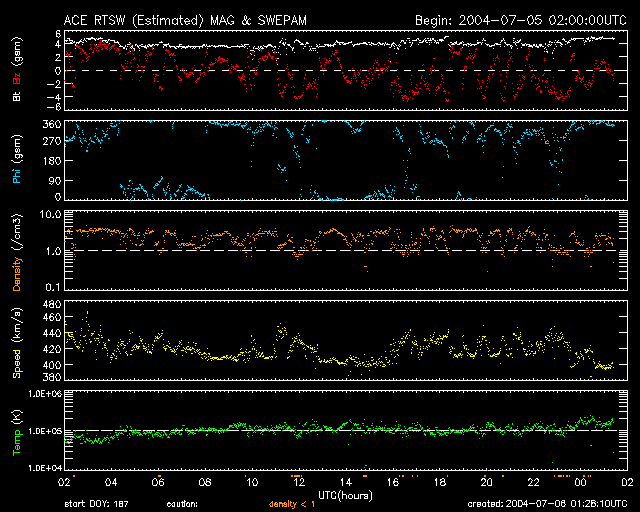 2004/ 7/ 6 10:30 更新 太陽フレア、太陽風、磁気圏と宇宙天気は穏やかです。 担当 篠原 太陽風の速度は400km/秒へ緩やかに下がっています(ACEの黄色線)。 磁気圏も概ね穏やかです。 AE指数によるとオーロラ活動もほとんど見られなかった様です。 太陽風の磁場強度は4nTと変化がありません(ACEの白線)。 ただ、南北に大きく振れる傾向が見られています(赤線が上下に変化しています)。 この影響で、AE指数が最新の時間帯(右端)でやや強まっています。 しかし、太陽風の速度が遅いので、激しい変化になる事はないでしょう。 SOHO EIT284の太陽画像は、全面同じ様な明るさで、 コロナホールを示す暗い部分は全く見られません。 27日周期も参考にすると、これから5日間程度は穏やかな日が続くでしょう。 放射線帯の高エネルギー電子ははっきりと減少しています。 太陽黒点は、本当に微かになっています。 X線データでも、大変小さな変化しか見られませんでした。 SOHO衛星のEIT284カメラの映像 (c) SOHO (ESA & NASA)